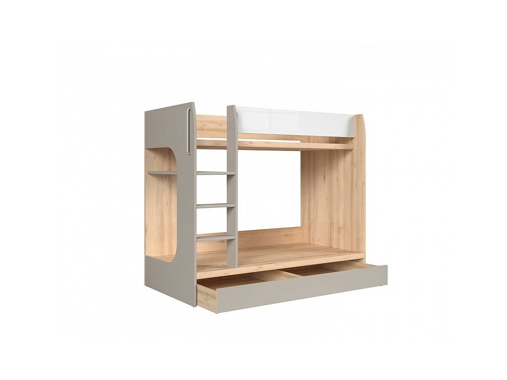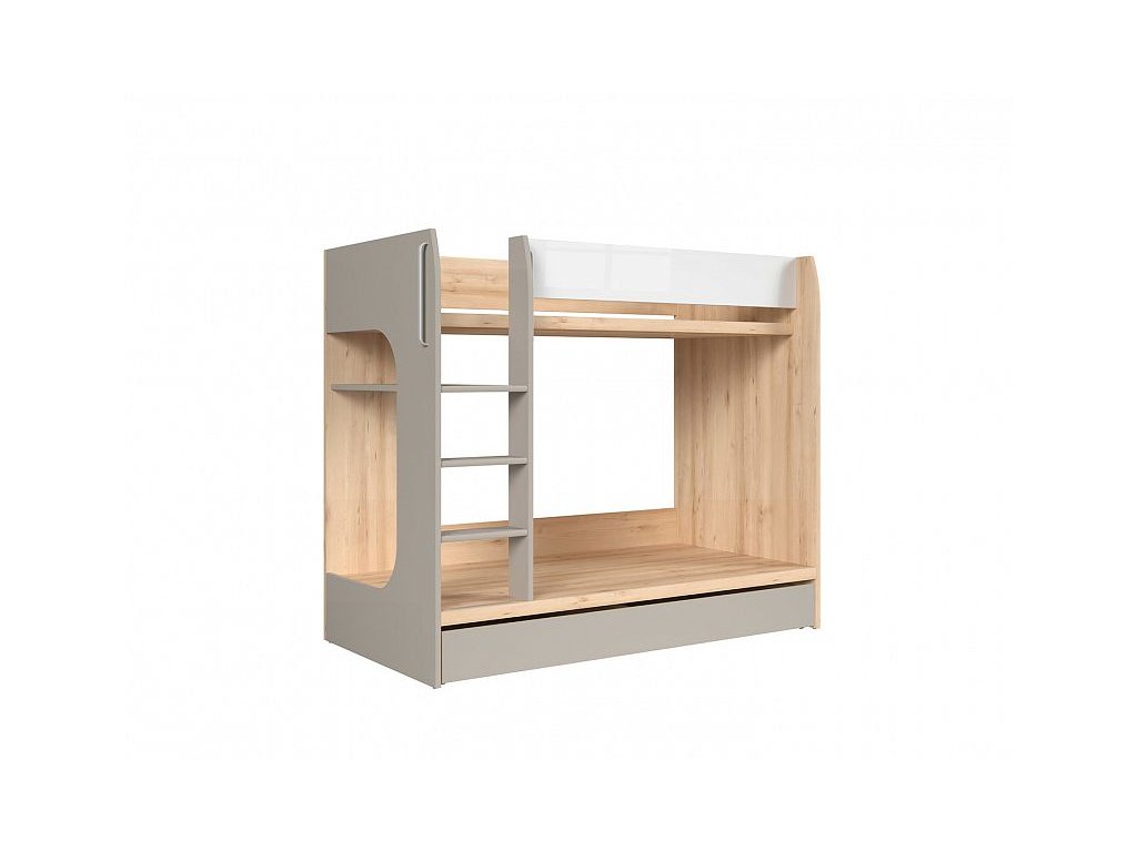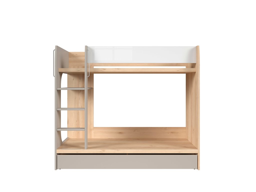 Patrová postel Namek v barevném provedení buk iconic/bílý lesk/šedá je velmi moderní a elegantní.