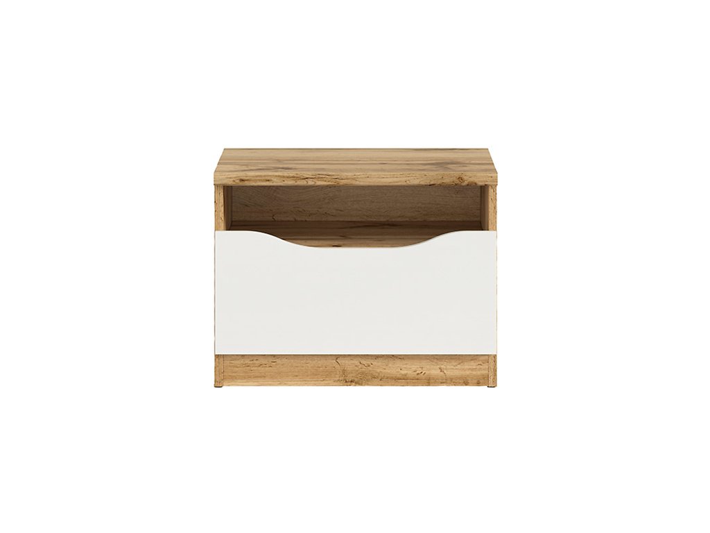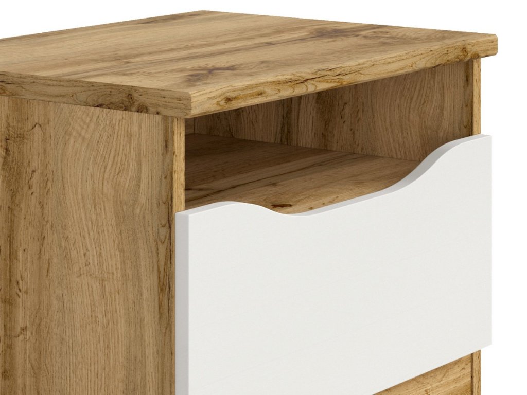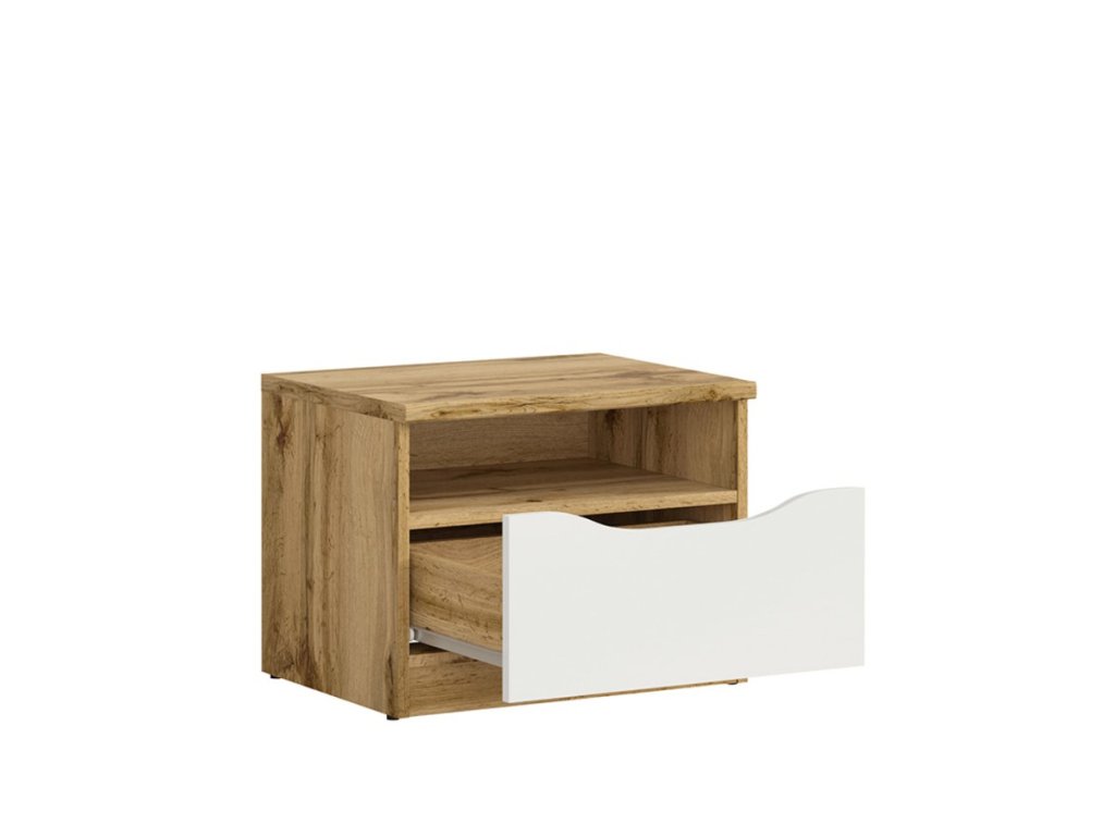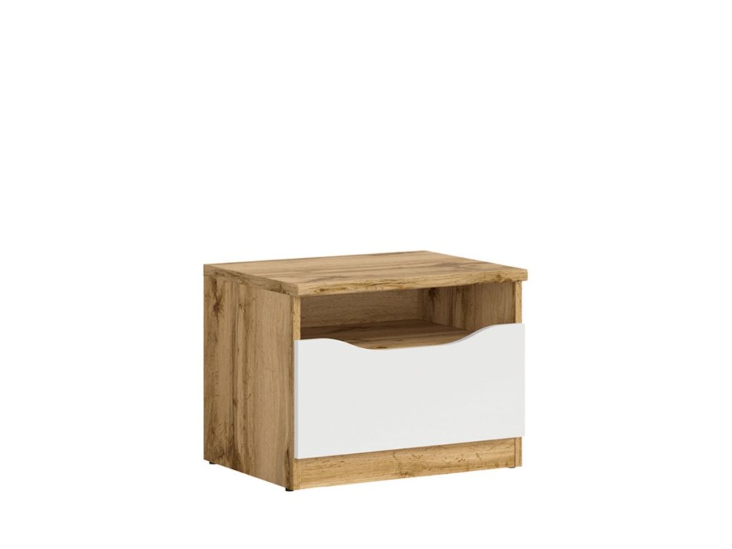 Noční stolek NUIS je vyroben v moderní barevné kombinaci dub wotan a bílý lesk, z kvalitního lamina, které se velmi dobře udržuje.