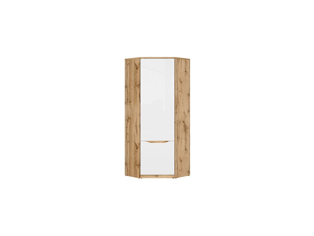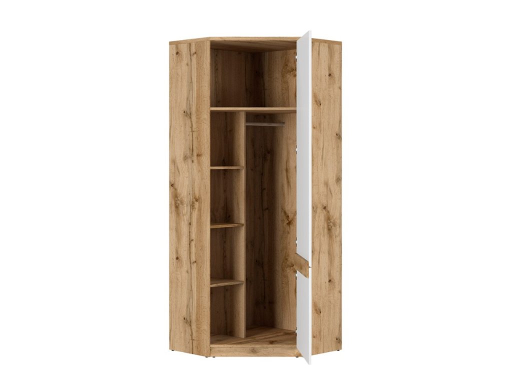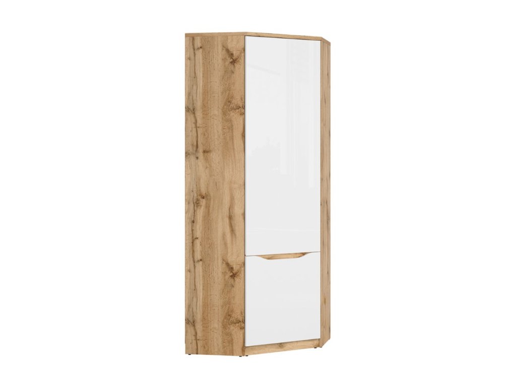 Rohová šatní skříň NUIS SZFN1D v barvě bílá lesk/dub wotan Vám nabízí spoustu úložného místa a maximalní využití prostoru.