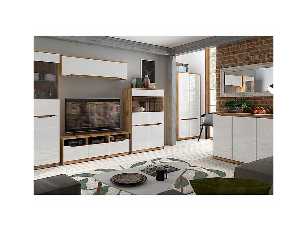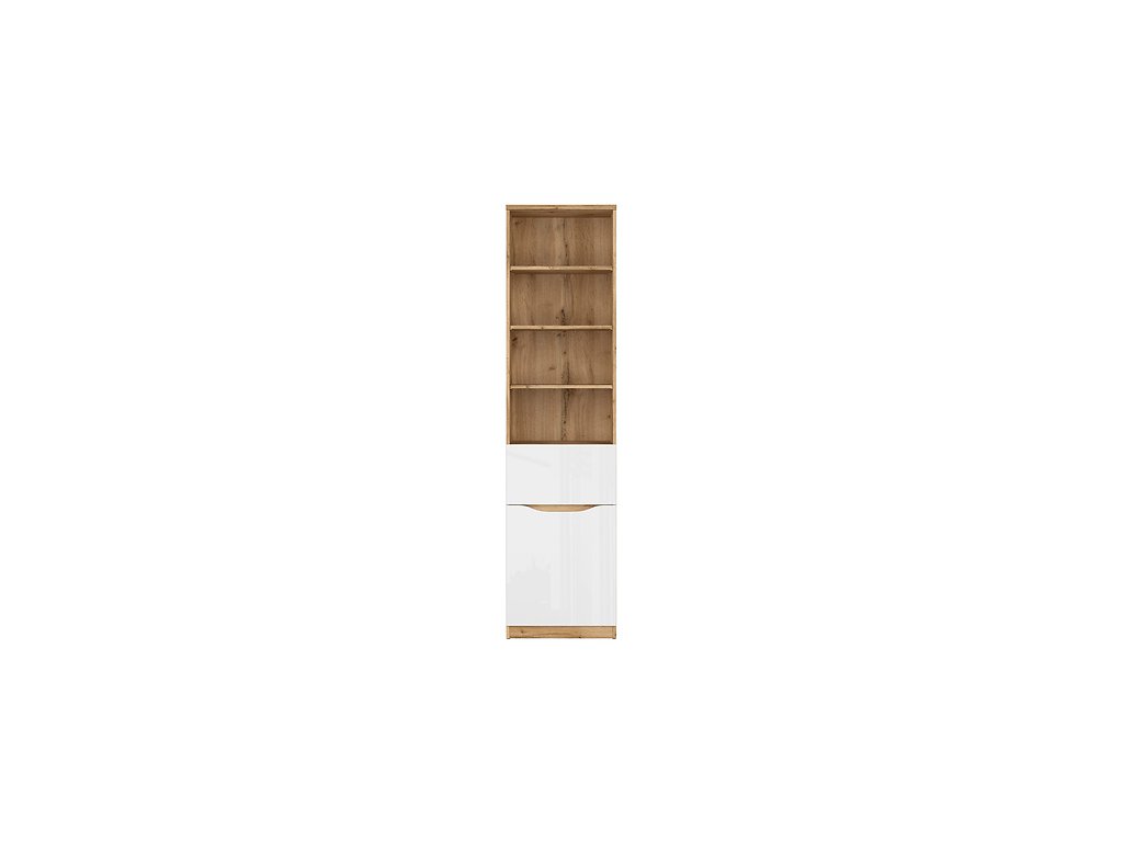 Barevné provedení dub wotan/bílý lesk. Regál má otevřenou horní část, jednu zásuvku a dvířka.