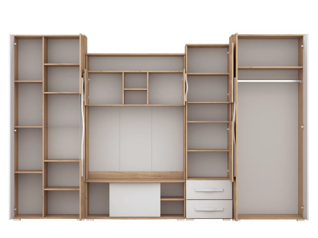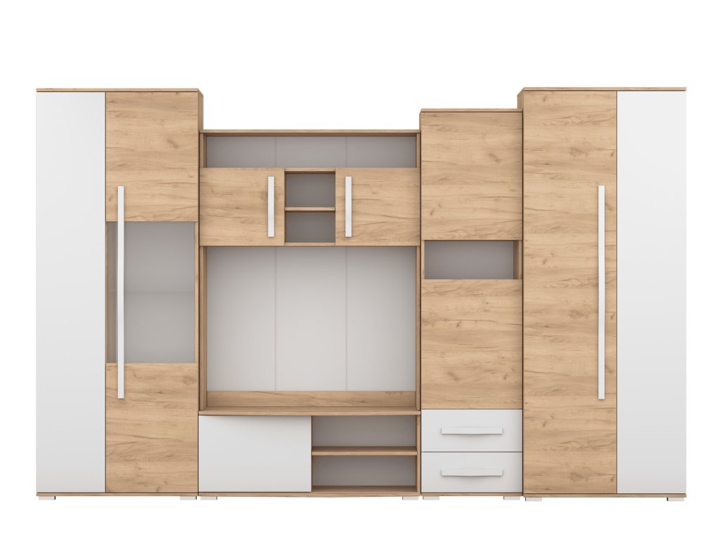 Je perfektní stěna do obývacího pokoje, který chceme zařídit jedinečným způsobem. Modernost dodává atraktivní barevné provedení a zejména dřevěné rukojeti ohnuté pod úhlem, které jsou extrémně odolné a velmi zdůrazňují jedinečný a originální vzhled stěny. Další výhodou je velmi prostorná skříň a knihovna s policemi.