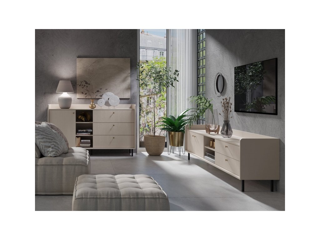 Tato nábytková řada je velmi moderní a elegantní. Díky světlému provedení vynikne dobře na tmavším pozadí a dobře se kombinuje s ostatním vybavením v místnosti. Za povšimnutí stojí zaoblené rohy, které ozvláštňují tuto kolekci a činí ji velmi atraktivní. Stejně tak jako dvířka, která mají jemnou strukturu. Vyšší nožičky jsou v současné době trendy, umožňují pohodlný úklid pomocí robotického vysavače.