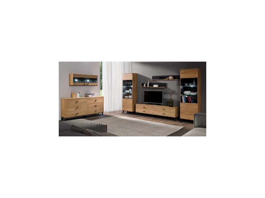 Sektor John je moderní nábytek charakteristický především svými nožkami. Sektor, který má korpus v odstínu dubu Lefkas, podtrhují dodatky v černé barvě. Pro inspiraci jsme připravili několik sestav, avšak komponenty nábytku John je možné zakoupit i jednotlivě, takže si můžete vytvořit obývací pokoj podle své vlastní představy. Nábytek je vyroben z kvalitního lamina a odolnost při každodenním použití zajišťují ABS hrany. K proskleným dílům sektoru lze dokoupit LED osvětlení.