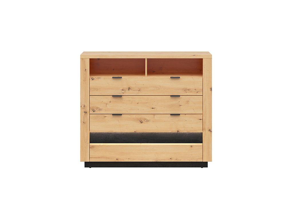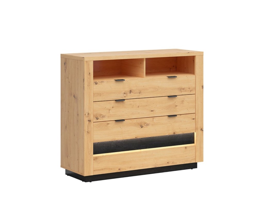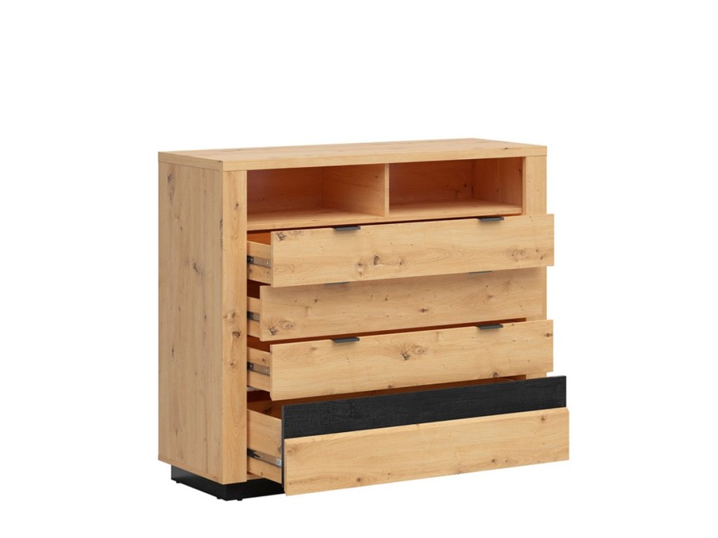 Komoda Ostia KOM4S je decentní a zároveň moderní kousek nábytku, který je díky kombinaci barev dub artisan/černý lesk velmi žádaný.