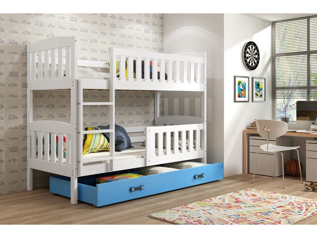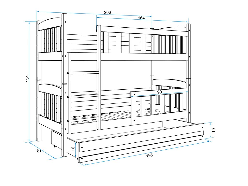 Dětská patrová postel Kuba je určena pro ty, kteří pro své dítě hledají funkčnost a kvalitu. Postel je vyrobena z borovicového dřeva a má stabilní konstrukci. Hrany jsou zaoblené a zábrana na horní i dolní posteli, zajišťují bezpečnost a pohodlí dítěte. Žebřík si můžete podle potřeby umístit na pravou, nebo levou stranu postele. V případě potřeby je možno palandu rozložit na dvě samostatné postele. Součástí postele je 2x zábrana, praktický úložný prostor na kolečkách, 2x rošt a 2x pěnová matrace se snímatelným potahem. Plocha pro spaní je 2x 90x200 cm. Tloušťka matrace je 7cm. Postel je dodávána v demontu a součástí je montážní plánek včetně všech potřebných spojovacích materiálů. Vyobrazené dekorace nejsou v ceně.