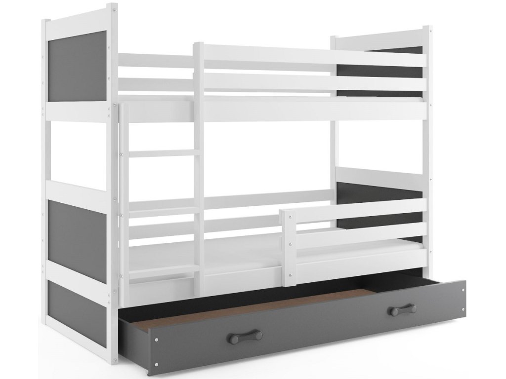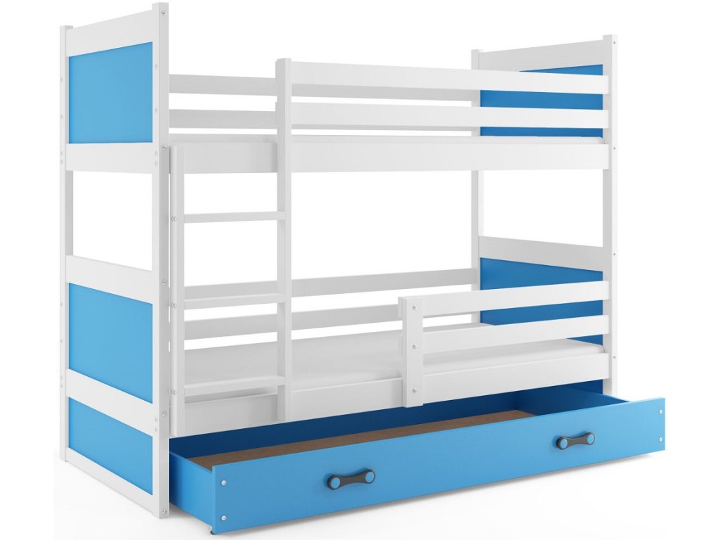 Dětská patrová postel Riky je určena pro ty, kteří pro své dítě hledají funkčnost, moderní design a kvalitu. Postel je vyrobena z borovicového dřeva v kombinaci s MDF deskou (barevné panely na bocích postele). Její stabilní konstrukce, zaoblené hrany a zábrana na horní i dolní posteli, zajišťují bezpečnost a pohodlí dítěte. Žebřík si můžete podle potřeby umístit na pravou, nebo levou stranu postele. Když děti patrová postel omrzí, je možno palandu rozložit na dvě samostatné postele. Součástí postele je 2x zábrana, praktický úložný prostor na kolečkách, 2x rošt a 2x pěnová matrace s doporučenou nosností do 70 kg. Tloušťka matrace je 7cm. Plocha pro spaní je 2x 90x200 cm. Postel je dodávána v demontu a součástí je montážní plánek včetně všech potřebných spojovacích materiálů. Vyobrazené dekorace nejsou v ceně.
