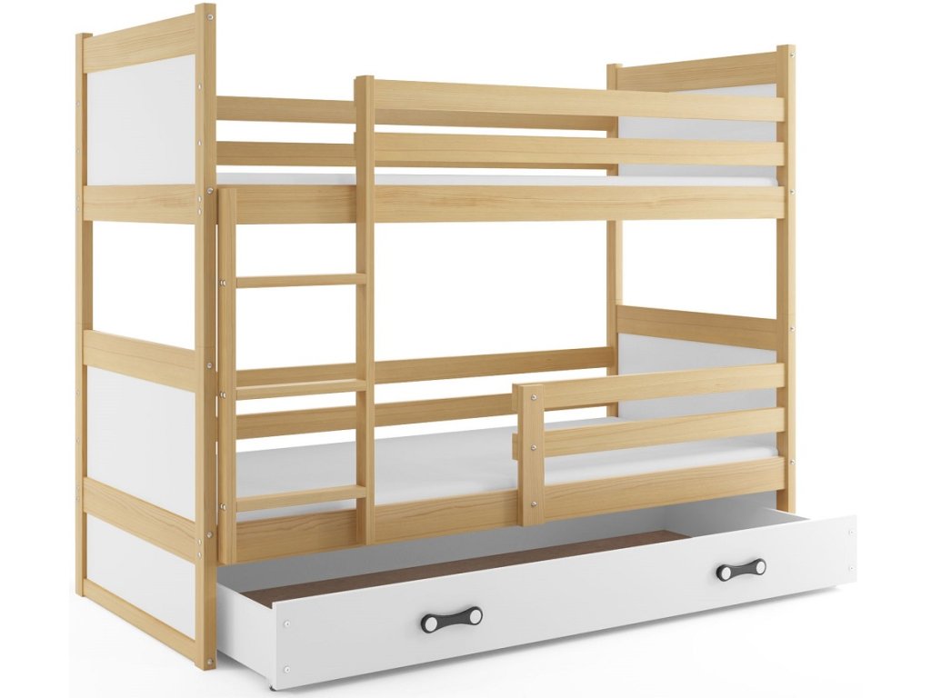 Dětská patrová postel Riky je určena pro ty, kteří pro své dítě hledají funkčnost, moderní design a kvalitu. Postel je vyrobena z borovicového dřeva v kombinaci s MDF deskou (barevné panely na bocích postele). Její stabilní konstrukce, zaoblené hrany a zábrana na horní i dolní posteli, zajišťují bezpečnost a pohodlí dítěte. Žebřík si můžete podle potřeby umístit na pravou, nebo levou stranu postele. Když děti patrová postel omrzí, je možno palandu rozložit na dvě samostatné postele. Součástí postele je 2x zábrana, praktický úložný prostor na kolečkách, 2x rošt a 2x pěnová matrace s doporučenou nosností do 70 kg. Tloušťka matrace je 7cm. Plocha pro spaní je 2x 90x200 cm. Postel je dodávána v demontu a součástí je montážní plánek včetně všech potřebných spojovacích materiálů. Vyobrazené dekorace nejsou v ceně.