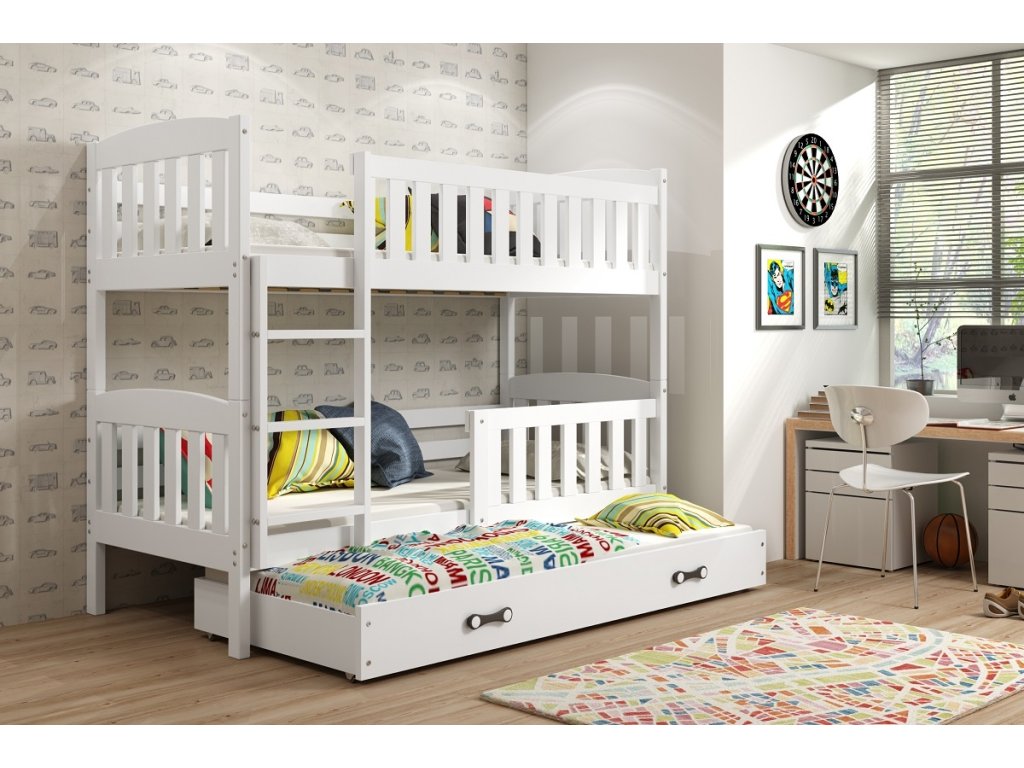 Dětská patrová postel Kuba je výbornou volbou všech rodičů, kteří pro své dítě hledají funkčnost, moderní design a kvalitu. Postel je vyrobena z kvalitního borovicového dřeva. Její stabilní konstrukce, zaoblené hrany a zábrana na horní i dolní posteli, zajišťují bezpečnost a pohodlí dítěte. Žebřík si můžete podle potřeby umístit na pravou, nebo levou stranu postele. Když děti patrová postel omrzí, je možno palandu rozložit na dvě samostatné postele. Součástí postele je také praktická přistýlka s matrací, kterou můžete využít pro další dítě, nebo když u Vašich dětí bude chtít přespat kamarád/ka. Všechny části postele mají rošt a pěnovou matraci v ceně. Tloušťka matrace je 7cm. Plocha pro spaní je 90x200 cm (vrchní a spodní část) a 80x190 cm (přistýlka). Postel je dodávána v demontu a součástí je montážní plánek včetně všech potřebných spojovacích materiálů. Vyobrazené doplňky a dekorace nejsou v ceně.