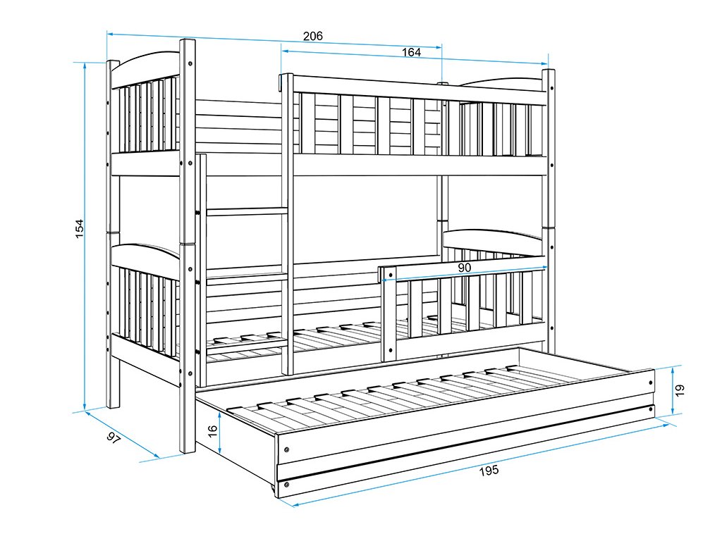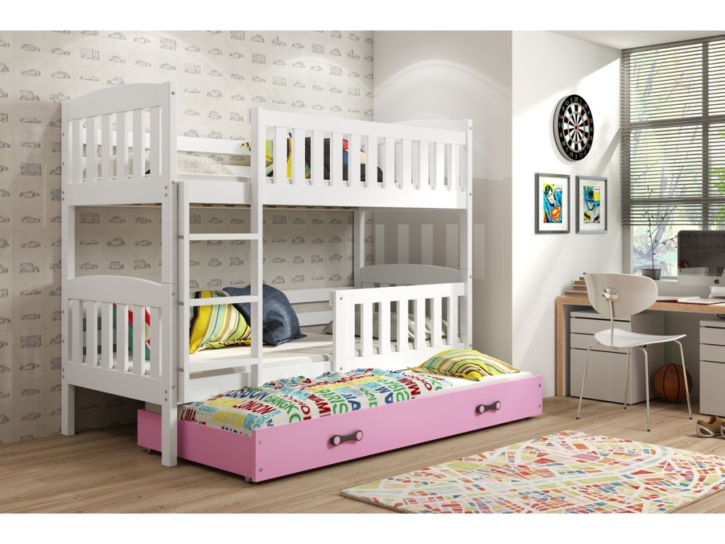 Dětská patrová postel Kuba je výbornou volbou všech rodičů, kteří pro své dítě hledají funkčnost, moderní design a kvalitu. Postel je vyrobena z kvalitního borovicového dřeva. Její stabilní konstrukce, zaoblené hrany a zábrana na horní i dolní posteli, zajišťují bezpečnost a pohodlí dítěte. Žebřík si můžete podle potřeby umístit na pravou, nebo levou stranu postele. Když děti patrová postel omrzí, je možno palandu rozložit na dvě samostatné postele. Součástí postele je také praktická přistýlka s matrací, kterou můžete využít pro další dítě, nebo když u Vašich dětí bude chtít přespat kamarád/ka. Všechny části postele mají rošt a pěnovou matraci v ceně. Tloušťka matrace je 7cm. Plocha pro spaní je 90x200 cm (vrchní a spodní část) a 80x190 cm (přistýlka). Postel je dodávána v demontu a součástí je montážní plánek včetně všech potřebných spojovacích materiálů. Vyobrazené doplňky a dekorace nejsou v ceně.