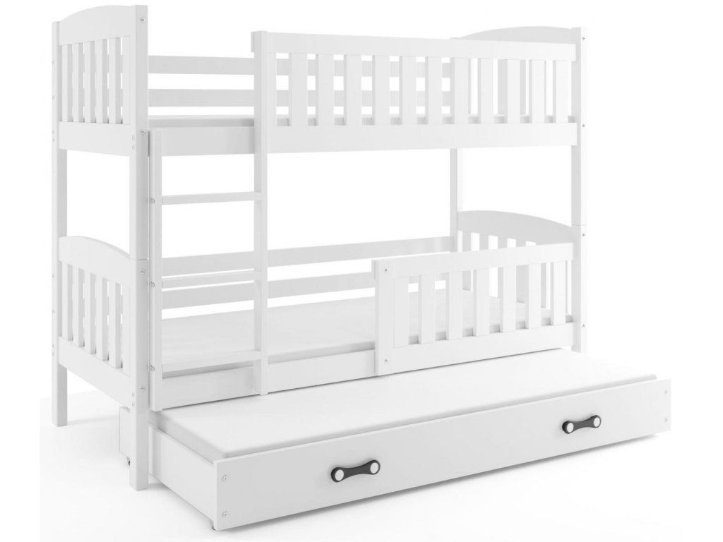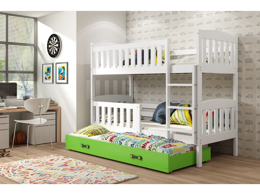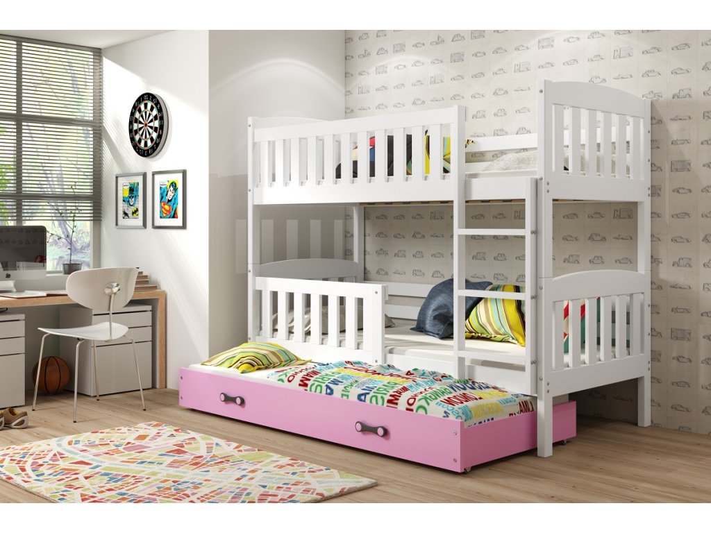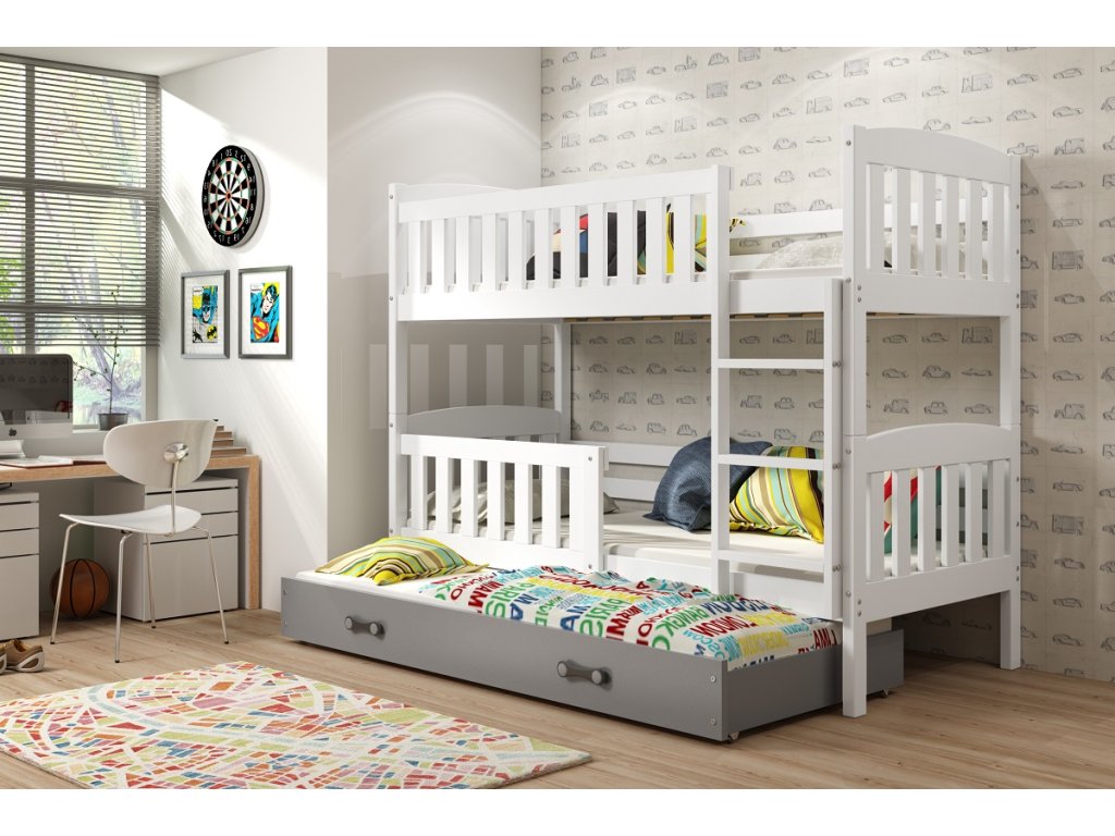 Dětská patrová postel Kuba je výbornou volbou všech rodičů, kteří pro své dítě hledají funkčnost, moderní design a kvalitu. Postel je vyrobena z kvalitního borovicového dřeva. Její stabilní konstrukce, zaoblené hrany a zábrana na horní i dolní posteli, zajišťují bezpečnost a pohodlí dítěte. Žebřík si můžete podle potřeby umístit na pravou, nebo levou stranu postele. Když děti patrová postel omrzí, je možno palandu rozložit na dvě samostatné postele. Součástí postele je také praktická přistýlka s matrací, kterou můžete využít pro další dítě, nebo když u Vašich dětí bude chtít přespat kamarád/ka. Všechny části postele mají rošt a pěnovou matraci v ceně. Tloušťka matrace je 7cm. Plocha pro spaní je 90x200 cm (vrchní a spodní část) a 80x190 cm (přistýlka). Postel je dodávána v demontu a součástí je montážní plánek včetně všech potřebných spojovacích materiálů. Vyobrazené doplňky a dekorace nejsou v ceně.