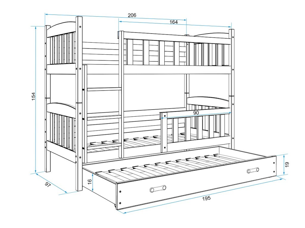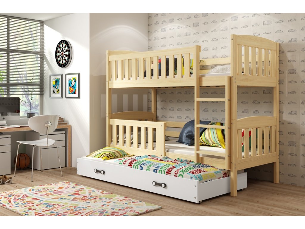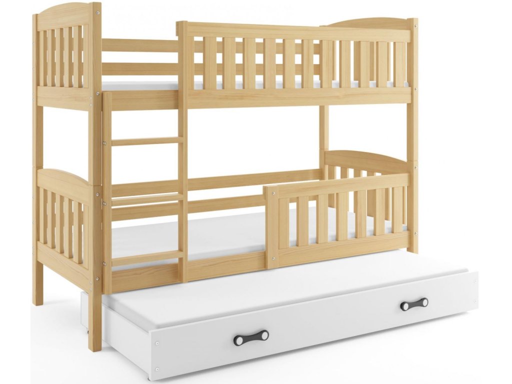 Dětská patrová postel Kuba je výbornou volbou všech rodičů, kteří pro své dítě hledají funkčnost, moderní design a kvalitu. Postel je vyrobena z kvalitního borovicového dřeva. Její stabilní konstrukce, zaoblené hrany a zábrana na horní i dolní posteli, zajišťují bezpečnost a pohodlí dítěte. Žebřík si můžete podle potřeby umístit na pravou, nebo levou stranu postele. Když děti patrová postel omrzí, je možno palandu rozložit na dvě samostatné postele. Součástí postele je také praktická přistýlka s matrací, kterou můžete využít pro další dítě, nebo když u Vašich dětí bude chtít přespat kamarád/ka. Všechny části postele mají rošt a pěnovou matraci v ceně. Tloušťka matrace je 7cm. Plocha pro spaní je 90x200 cm (vrchní a spodní část) a 80x190 cm (přistýlka). Postel je dodávána v demontu a součástí je montážní plánek včetně všech potřebných spojovacích materiálů. Vyobrazené doplňky a dekorace nejsou v ceně.