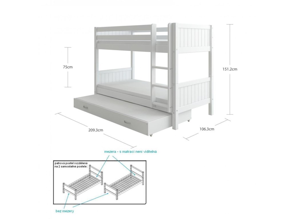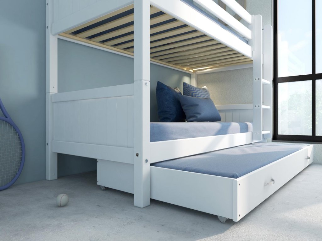 Patrová postel s přistýlkou Romantic je skvělým řešením, pokud sourozenci sdílejí pokoj – nebo potřebujete přistýlku pro časté návštěvy přátel a rodiny. Poskytuje maximální flexibilitu - podle potřeby může být ROZDĚLENA NA 2 SAMOSTATNÉ POSTELE.