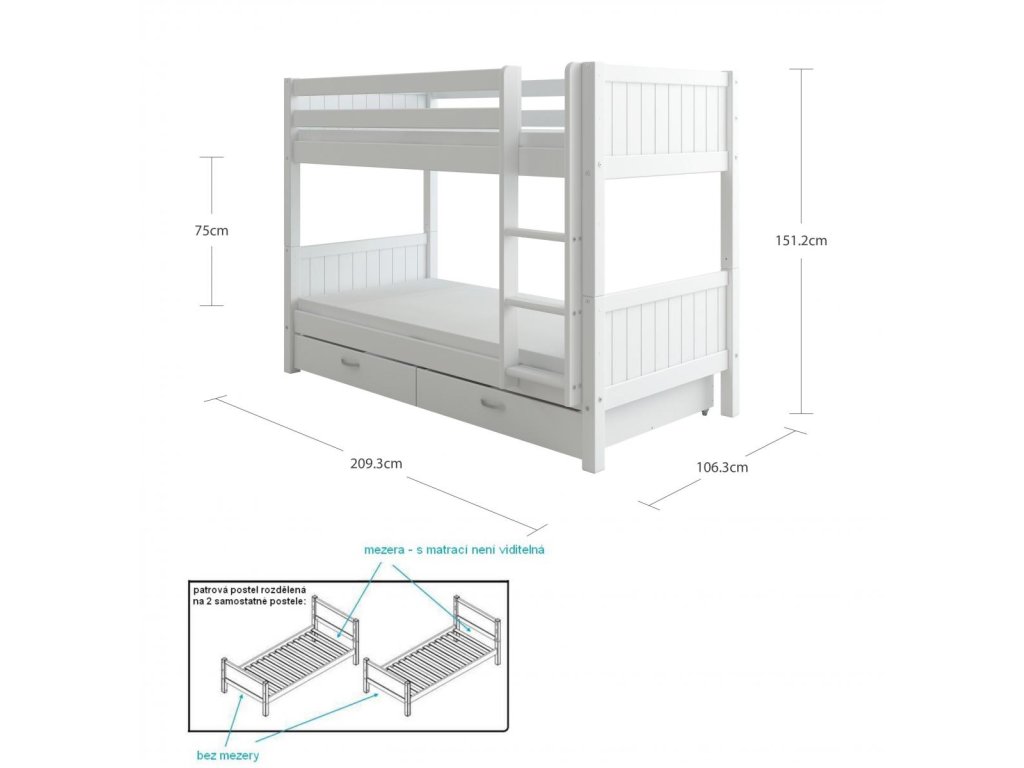 Zboží je dodáváno v demontu BEZ MATRACÍ. Doporučujeme dokoupit 2ks matrace 90 x 200 cm. Součástí je schematický návod na montáž včetně všech spojovacích prvků. Vyobrazené doplňky a dekorace nejsou v ceně.