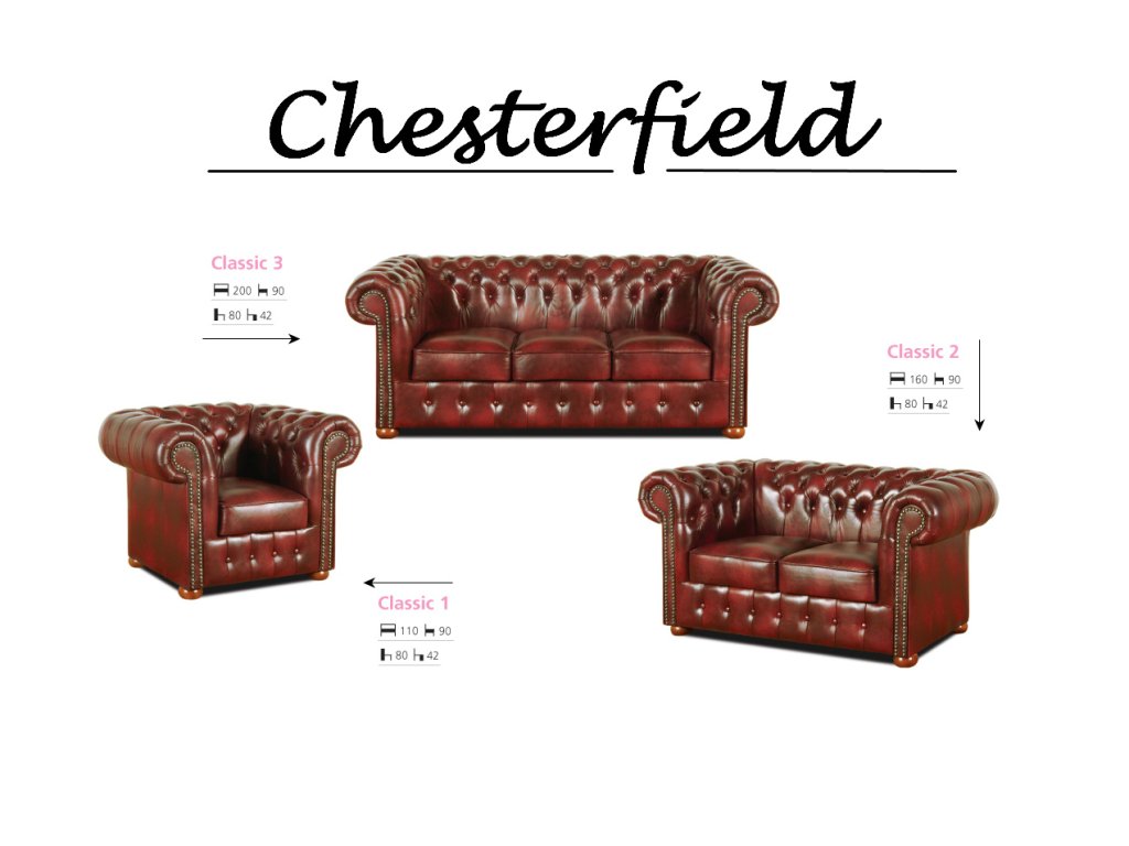 Objevte nadčasovou eleganci a prvotřídní pohodlí s koženými křesly a pohovkami Chesterfield. Každý detail od klasického hlubokého prošívání až po luxusní pravou hovězí kůži zaručuje jedinečný styl, který povýší váš domov či komerční prostor na novou úroveň. Vynikající řemeslné zpracování zaručuje nejen krásu, ale i dlouhou životnost. Pohovky Chesterfield jsou k dispozici v různých velikostech od křesel, dvoumístných a třímístných pohovek, až po prostorné čtyřmístné, rohové a atypické varianty.