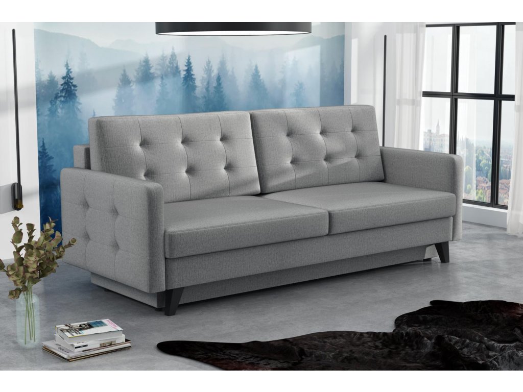 Pohovka Fjord je krásným elegantním kouskem s nádechem RETRO designu a výborně zapadne do každého interiéru. Retro design podtrhují zešikmené dřevěné nohy a látkové knoflíky na opěrce. Pohovka je rozkládací a samozřejmostí je i nepostradatelný úložný prostor. Jednoduchým rozložením pomocí automatu vznikne dostatečně prostorné lůžko k občasnému přespání Vaší návštěvy. Výplň sedáku tvoří vlnité pružiny v kombinaci s pružinami bonell a kvalitní PUR pěnou. Pohovka je celočalouněná, takže ji můžete umístit i do prostoru. Výborně se hodí do obývacího pokoje, do pracovny či pokoje pro hosty. Pohovku nabízíme v několika trendy barvách. Fotografie pohovky v rozkladu jsou pouze ilustrační. Správný barevný odstín je na úvodní fotografii.