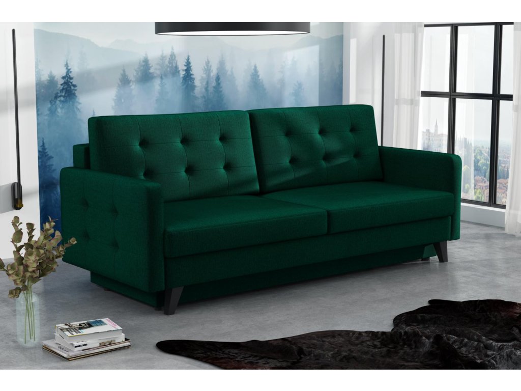 Pohovka Fjord je krásným elegantním kouskem s nádechem RETRO designu a výborně zapadne do každého interiéru. Retro design podtrhují zešikmené dřevěné nohy a látkové knoflíky na opěrce. Pohovka je rozkládací a samozřejmostí je i nepostradatelný úložný prostor. Jednoduchým rozložením pomocí automatu vznikne dostatečně prostorné lůžko k občasnému přespání Vaší návštěvy. Výplň sedáku tvoří vlnité pružiny v kombinaci s pružinami bonell a kvalitní PUR pěnou. Pohovka je celočalouněná, takže ji můžete umístit i do prostoru. Výborně se hodí do obývacího pokoje, do pracovny či pokoje pro hosty. Pohovku nabízíme v několika trendy barvách. Fotografie pohovky v rozkladu jsou pouze ilustrační. Správný barevný odstín je na úvodní fotografii.
