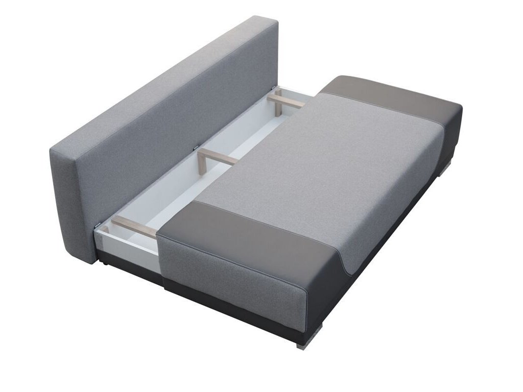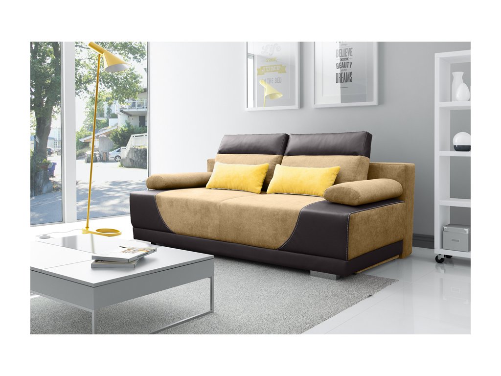 Moderní a velmi praktická rozkládací pohovka s úložným prostorem. Kombinace eko kůže a látky jí dodává zajímavý a moderní vzhled. Výplň pohovky tvoří pružiny bonell a faliste v kombinaci s kvalitní PUR pěnou. Jednoduchým rozkladem pomocí automatu vznikne lůžko vhodné k příležitostnému spaní. Pohovku dodáváme v několika barevných provedeních, které také naleznete v naší nabídce. V ceně pohovky jsou 2 velké opěrné polštáře, 2 polštáře po stranách, které plní funkci područí a dva malé žluté polštářky. Ostatní vyobrazené dekorace nejsou v ceně.