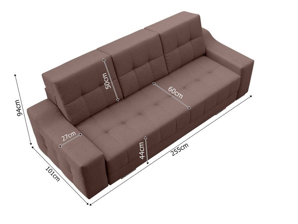Pohovka Týna je rozkládací a součástí je i praktický úložný prostor. Prošití a stříbrné nožky jí dodávají moderní a zároveň elegantní vzhled. Výplň pohovky tvoří vlnité pružiny faliste v kombinaci s kvalitní PUR pěnou. Rozkládání je díky automatu jednoduché a po rozložení vznikne lůžko vhodné k příležitostnému přespání. Pohovku dodáváme v několika barevných provedeních, které také naleznete v naší nabídce. Rozpis rozměrů najdete na přiloženém obrázku s nákresem. Součátí pohovky jsou 3 opětné polštáře a 2 malé dekorační polštářky. Ostatní vyobrazené dekorace nejsou v ceně.