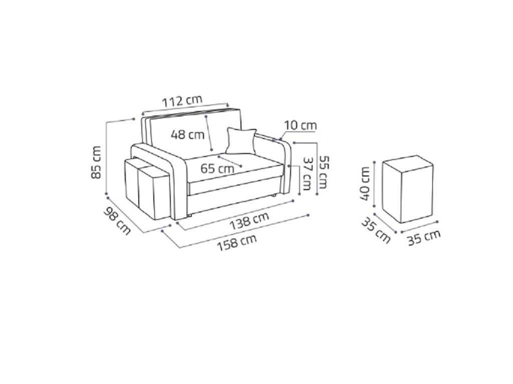 rozměry: šířka 138 cm, výška 85 cm, hloubka 98 cm, taburet: 35x35 cm / výška 40 cm