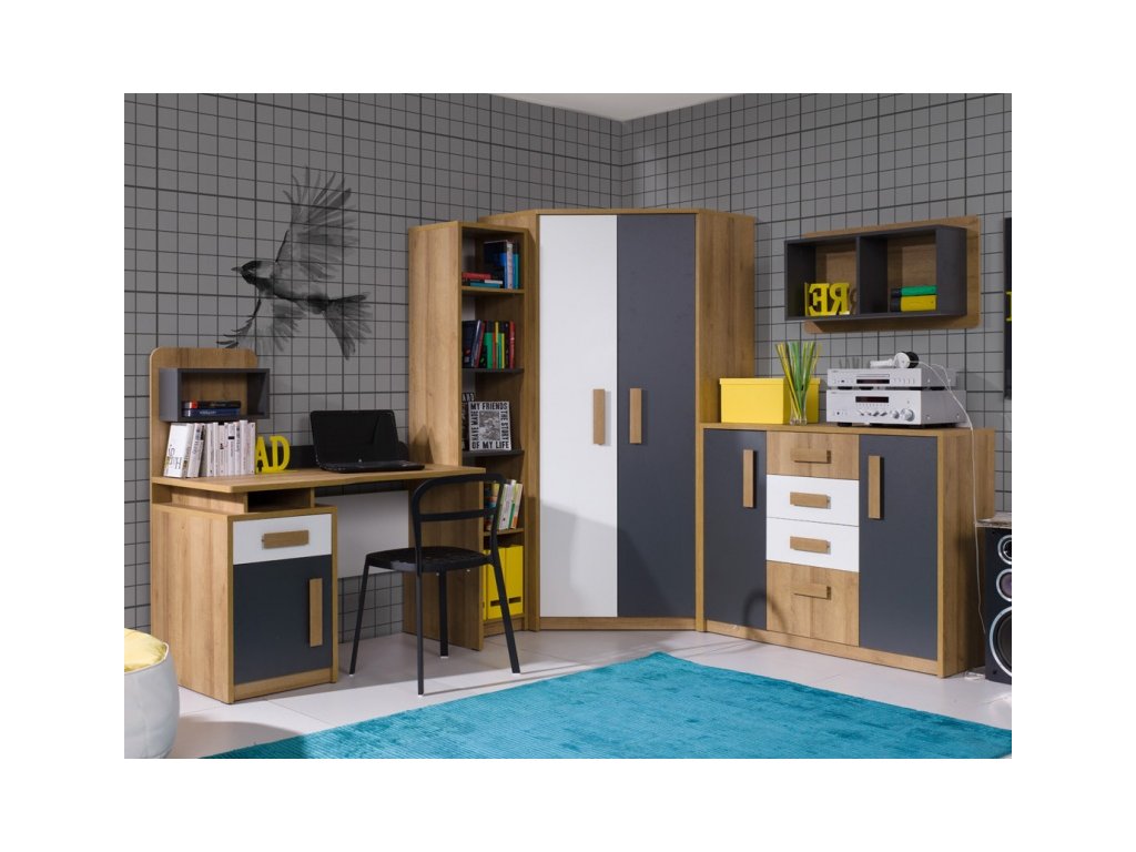 tento sektorový nábytek je vyráběn v atraktivních barvách. Dobře se hodí jak pro menší děti, tak i pro dospívající mládež. Pokud jej pořídíte již v útlém věku dítěte, zajisté mu vydrží až do ukončení studií. Barevné povedení je v kombinaci tří barev, zakládem je žádaná barva dub Riviera zlatý, která je doplněna barvou grafit a bílá barva krásně osvěžuje a dodává kolekci Quatro šmrc.