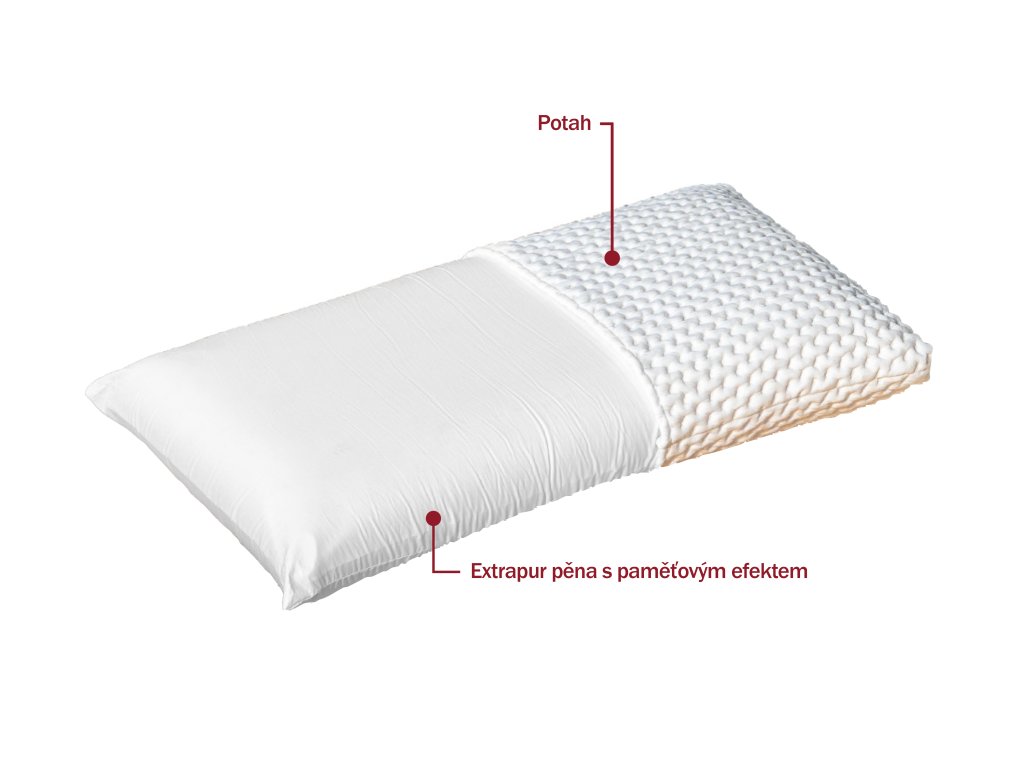 Luxusní polštáře obdélníkového tvaru z nové jedinečné pěny EXTRAPUR, která se díky paměťovému efektu přizpůsobí tvaru hlavy a rovnoměrně rozloží váhu těla. Poskytuje optimální oporu hlavy a úlevu krčním svalům během spánku. Pěna je ekologická a velmi prodyšná. Zachovává svůj tvar, je nedeformovatelná a příjemně měkká.