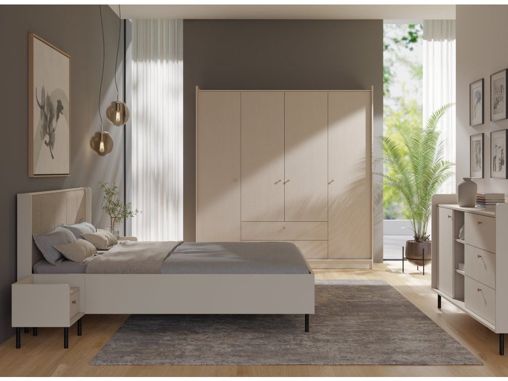 Tato nábytková řada je velmi moderní a elegantní. Díky světlému provedení vynikne dobře na tmavším pozadí a dobře se kombinuje s ostatním vybavením v místnosti. Za povšimnutí stojí zaoblené rohy, které ozvláštňují tuto kolekci a činí ji velmi atraktivní. Stejně tak jako dvířka, která mají jemnou strukturu. Vyšší nožičky jsou v současné době trendy, umožňují pohodlný úklid pomocí robotického vysavače.