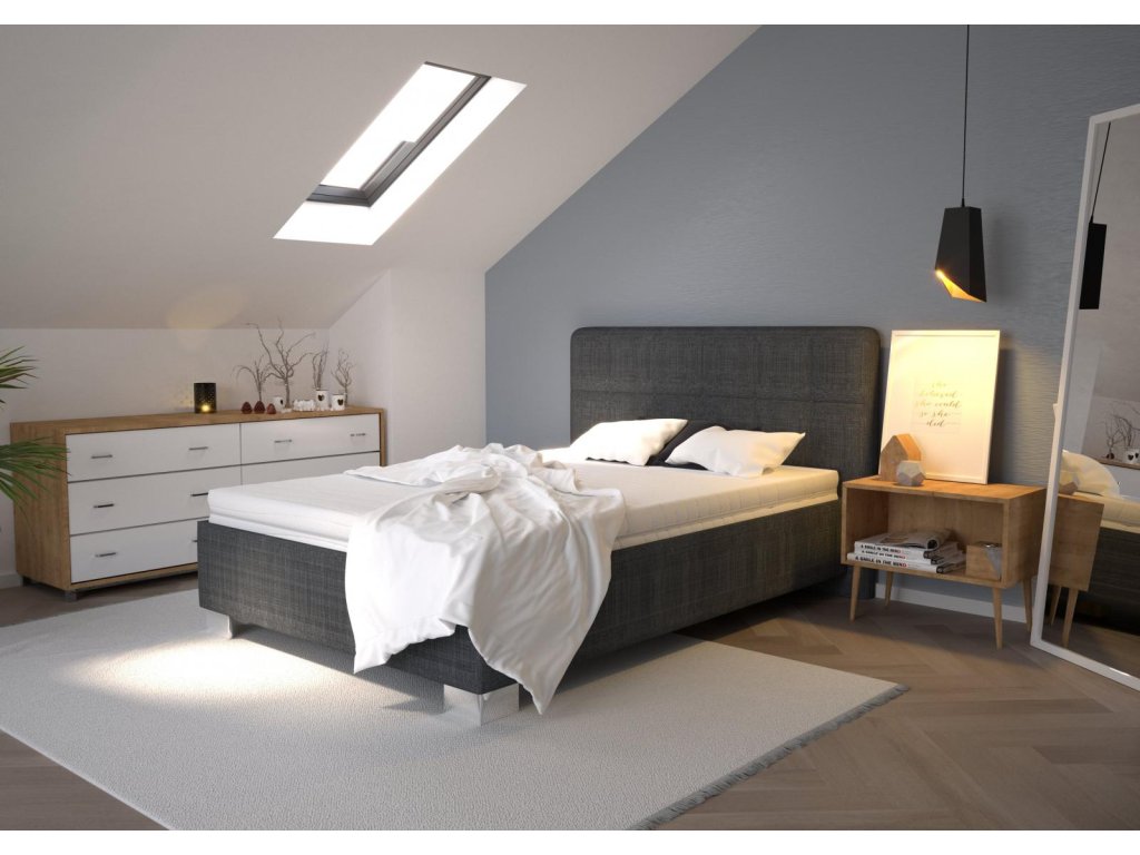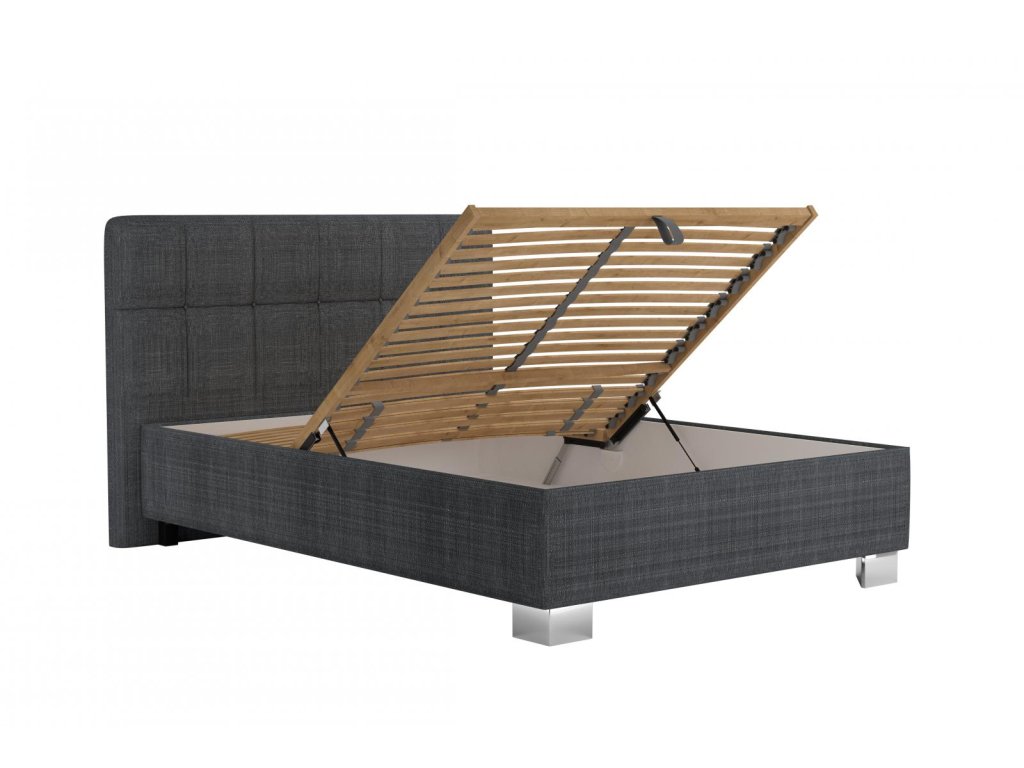 Moderní postel, která se hodí nejen do studentských nebo dětských pokojů, ale také do menších ložnic. Základem lůžka je 28 lamelový rošt s mechanickým polohováním hlavy a nohou (7 poloh hlavy, 1 poloha nohou), s nastavením tuhosti lamel a s popruhem proti přetížení. Rošt se skládá z 28 lamel uložených ve výkyvných kaučukových pouzdrech. Snadnější manipulaci při otevírání úložného prostoru zajišťují plynové písty. Součástí postele je úložný prostor, který se otevírá od nohou (pomocí plynových pístů). Tuto postel nabízíme také v dalších rozměrech. Zboží je dodáváno v demontu.