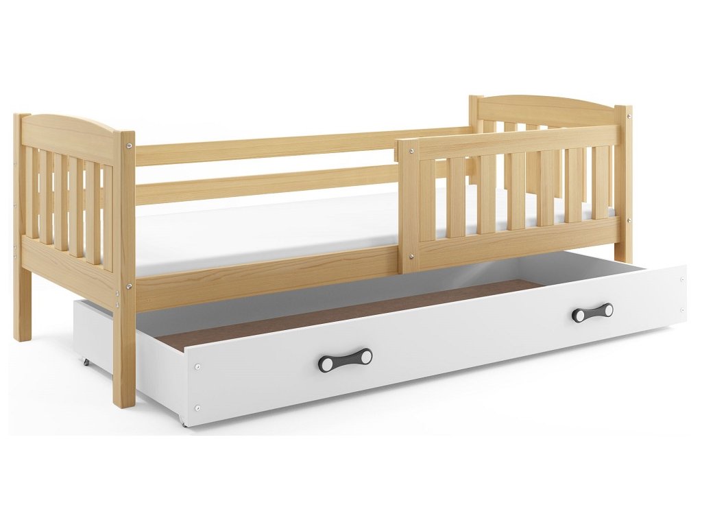 Dětská postel Kuba je určena pro ty, kteří pro své dítě hledají funkčnost, pohodlí a kvalitu. Postel je vyrobena z borovicového dřeva. Na lakování je použitý bezpečný, vodou ředitelný lak vyhovující normám. Její stabilní konstrukce, zaoblené hrany a zábrana, která je v ceně postele, zajišťují bezpečnost dítěte. Zábranu si můžete podle potřeby umístit na pravou, nebo levou stranu postele. Součástí postele je také praktický úložný prostor na kolečkách, rošt a pěnová matrace se snímatelným potahem. Tloušťka matrace je 7cm. Plocha pro spaní je 80x160 cm. Postel je dodávána v demontu a součástí je montážní plánek včetně všech potřebných spojovacích materiálů. Vyobrazené dekorace nejsou v ceně.