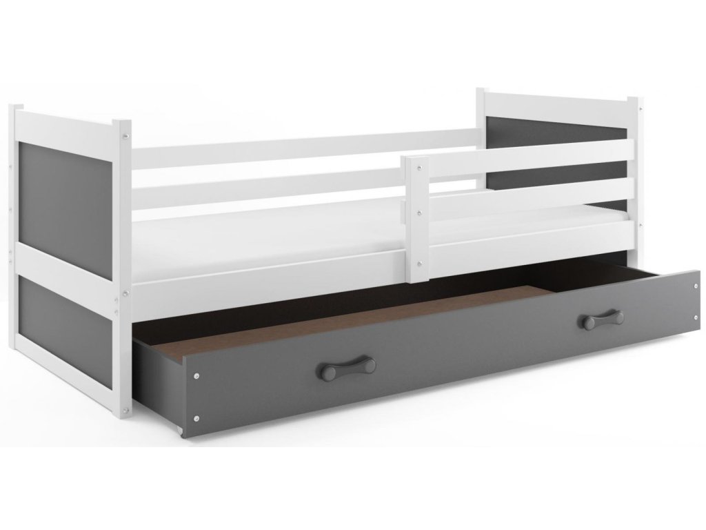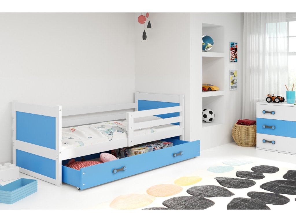 Dětská postel Riky je určena pro ty, kteří pro své dítě hledají funkčnost, moderní design a kvalitu. Postel je vyrobena z borovicového dřeva v kombinaci s MDF deskou (barevné panely na bocích postele). Její stabilní konstrukce, zaoblené hrany a zábrana, která je v ceně postele, zajišťují bezpečnost a pohodlí dítěte. Zábranu si můžete podle potřeby umístit na pravou, nebo levou stranu postele. Součástí postele je také praktický úložný prostor na kolečkách, rošt a pěnová matrace se snímatelným potahem. Tloušťka matrace je 7cm. Plocha pro spaní je 90x200 cm. Postel je dodávána v demontu a součástí je montážní plánek včetně všech potřebných spojovacích materiálů. Vyobrazené dekorace nejsou v ceně.