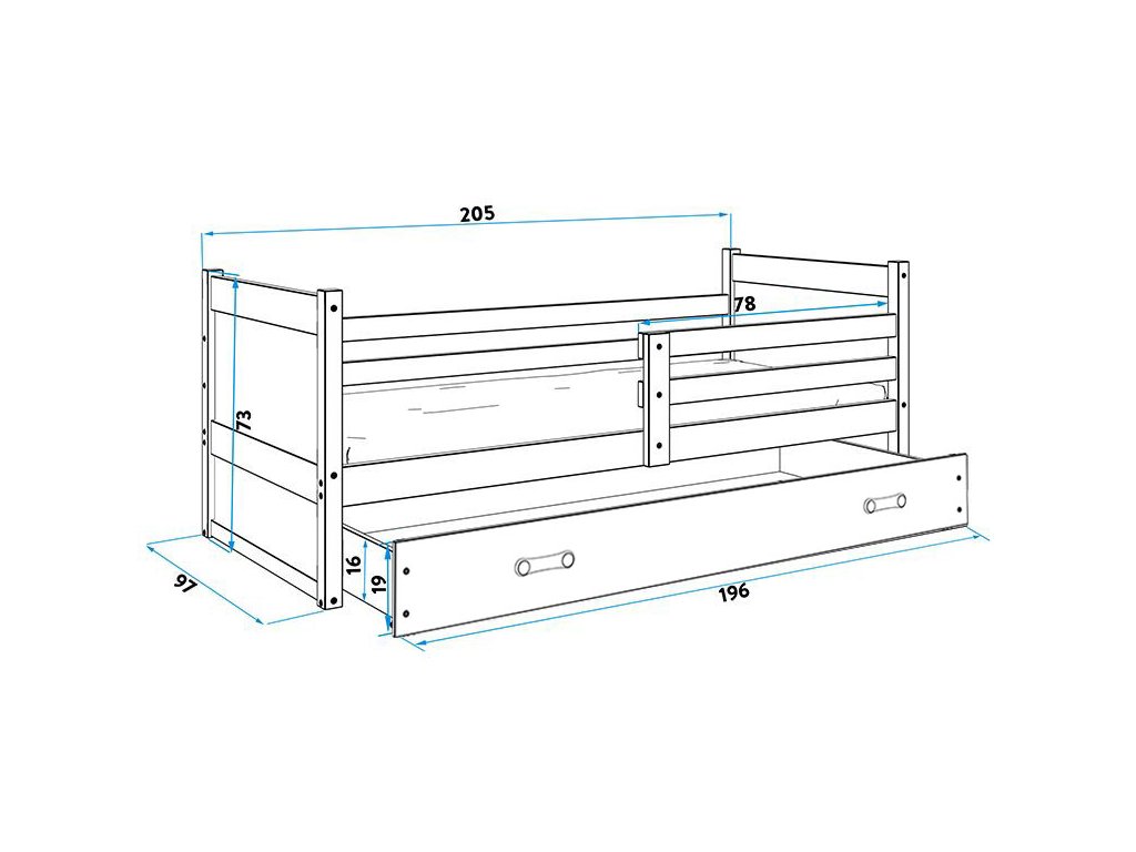 Dětská postel Riky je určena pro ty, kteří pro své dítě hledají funkčnost, moderní design a kvalitu. Postel je vyrobena z borovicového dřeva v kombinaci s MDF deskou (barevné panely na bocích postele). Její stabilní konstrukce, zaoblené hrany a zábrana, která je v ceně postele, zajišťují bezpečnost a pohodlí dítěte. Zábranu si můžete podle potřeby umístit na pravou, nebo levou stranu postele. Součástí postele je také praktický úložný prostor na kolečkách, rošt a pěnová matrace se snímatelným potahem. Tloušťka matrace je 7cm. Plocha pro spaní je 90x200 cm. Postel je dodávána v demontu a součástí je montážní plánek včetně všech potřebných spojovacích materiálů. Vyobrazené dekorace nejsou v ceně.