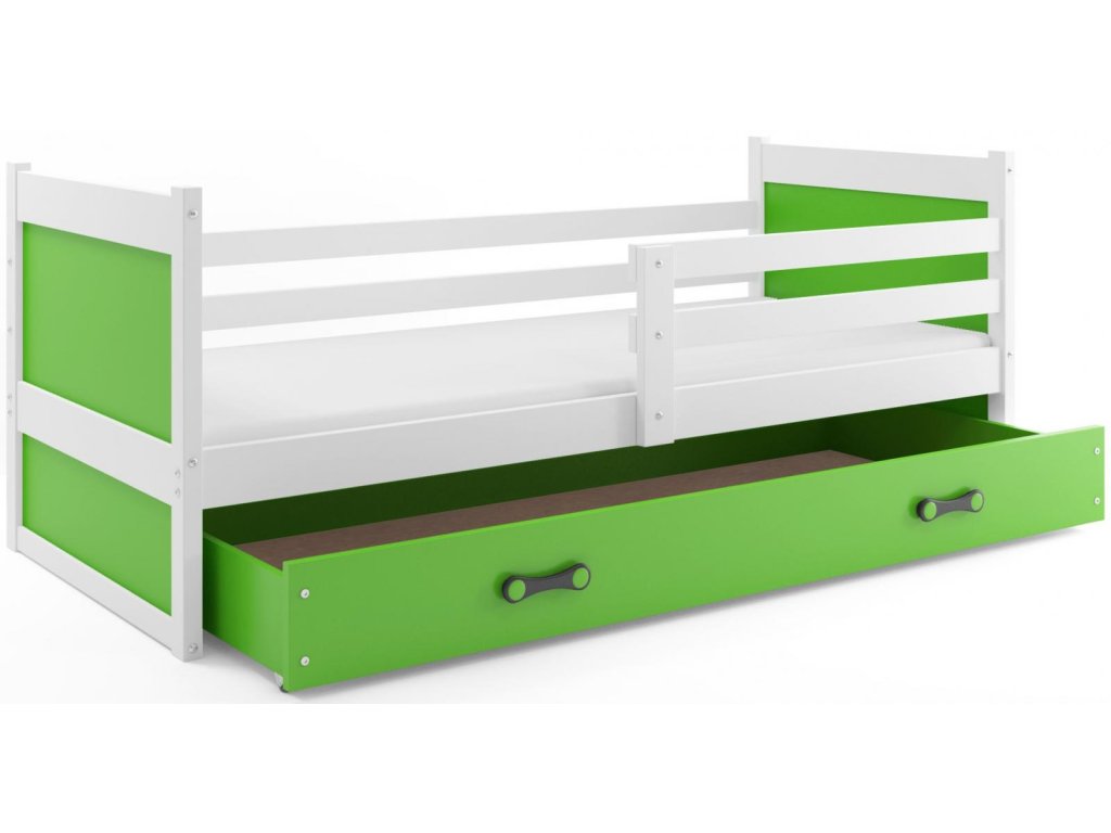 Dětská postel Riky je určena pro ty, kteří pro své dítě hledají funkčnost, moderní design a kvalitu. Postel je vyrobena z borovicového dřeva v kombinaci s MDF deskou (barevné panely na bocích postele). Její stabilní konstrukce, zaoblené hrany a zábrana, která je v ceně postele, zajišťují bezpečnost a pohodlí dítěte. Zábranu si můžete podle potřeby umístit na pravou, nebo levou stranu postele. Součástí postele je také praktický úložný prostor na kolečkách, rošt a pěnová matrace se snímatelným potahem. Tloušťka matrace je 7cm. Plocha pro spaní je 90x200 cm. Postel je dodávána v demontu a součástí je montážní plánek včetně všech potřebných spojovacích materiálů. Vyobrazené dekorace nejsou v ceně.