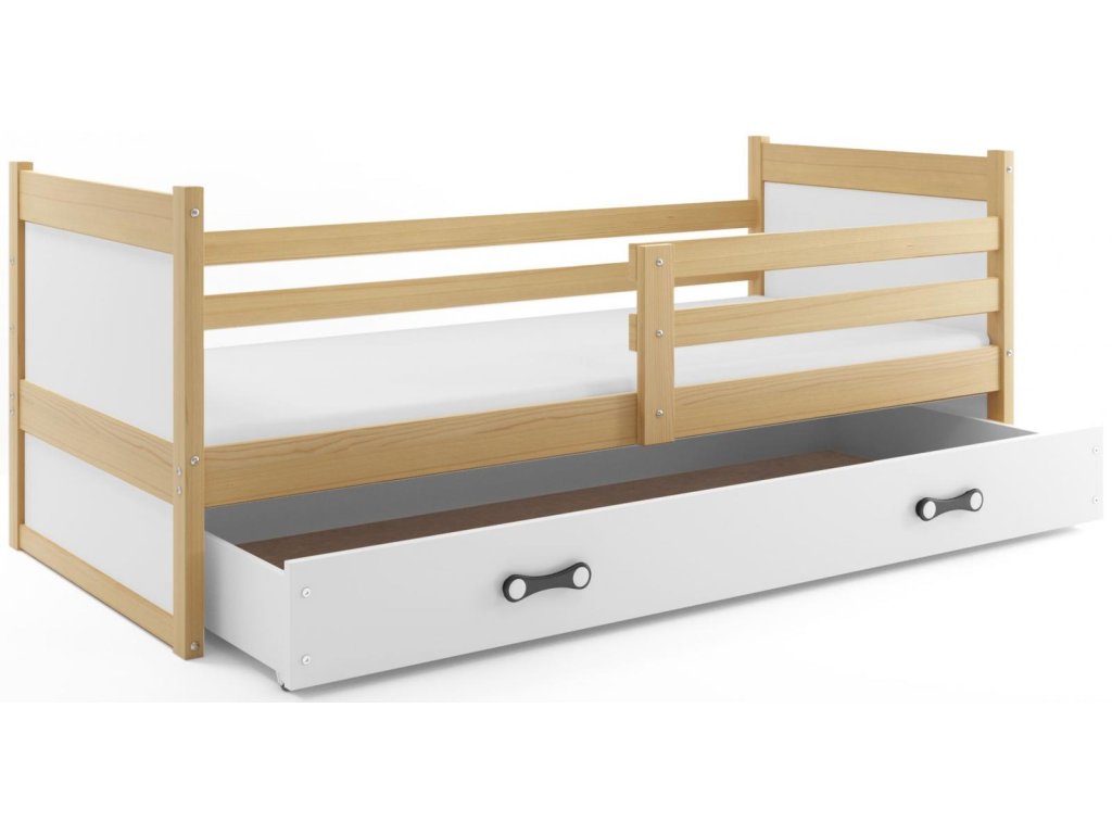 Dětská postel Riky je určena pro ty, kteří pro své dítě hledají funkčnost, moderní design a kvalitu. Postel je vyrobena z borovicového dřeva v kombinaci s MDF deskou (barevné panely na bocích postele). Její stabilní konstrukce, zaoblené hrany a zábrana, která je v ceně postele, zajišťují bezpečnost a pohodlí dítěte. Zábranu si můžete podle potřeby umístit na pravou, nebo levou stranu postele. Součástí postele je také praktický úložný prostor na kolečkách, rošt a pěnová matrace se snímatelným potahem. Tloušťka matrace je 7cm. Plocha pro spaní je 90x200 cm. Postel je dodávána v demontu a součástí je montážní plánek včetně všech potřebných spojovacích materiálů. Vyobrazené dekorace nejsou v ceně.