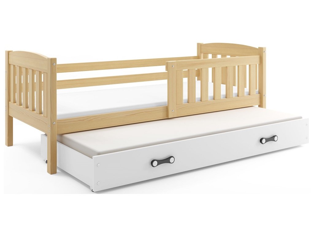 Dětská postel Kuba II je určena pro ty, kteří pro své dítě hledají funkčnost, pohodlí a kvalitu. Postel je vyrobena z borovicového dřeva. Její stabilní konstrukce, zaoblené hrany a zábrana, která je v ceně postele, zajišťují bezpečnost a pohodlí dítěte. Zábranu si můžete podle potřeby umístit na pravou, nebo levou stranu postele. Součástí postele je také praktická přistýlka s matrací, kterou můžete využít pro druhé dítě, nebo když u Vašeho dítěte bude chtít přespat kamarád/ka. Obě části postele mají rošt a pěnovou matraci se snímatelným potahem. Tloušťka matrace je 7cm. Plocha pro spaní je 90x200 cm (vrchní část) a 80x190 cm (přistýlka). Postel je dodávána v demontu a součástí je montážní plánek včetně všech potřebných spojovacích materiálů. Vyobrazené dekorace nejsou v ceně.