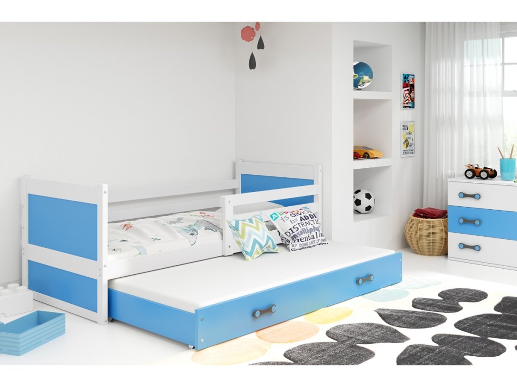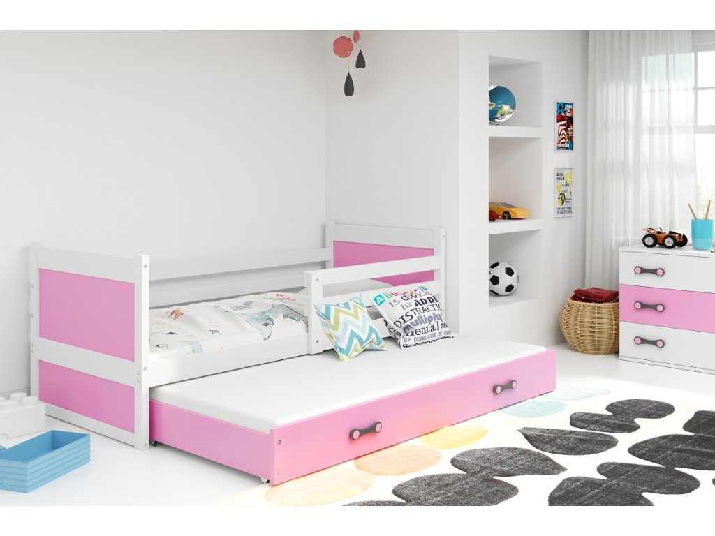 Dětská postel Riky II je určena pro ty, kteří pro své dítě hledají funkčnost, moderní design a kvalitu. Postel je vyrobena z borovicového dřeva v kombinaci s MDF deskou (barevné panely na bocích postele). Její stabilní konstrukce, zaoblené hrany a zábrana, která je v ceně postele, zajišťují bezpečnost a pohodlí dítěte. Zábranu si můžete podle potřeby umístit na pravou, nebo levou stranu postele. Součástí postele je také praktická přistýlka s matrací, kterou můžete využít pro druhé dítě, nebo když u Vašeho dítěte bude chtít přespat kamarád/ka. Obě části postele mají rošt a pěnovou matraci se snímatelným potahem. Tloušťka matrace je 7cm. Plocha pro spaní je 90x200 cm (vrchní část) a 80x190 cm (přistýlka). Postel je dodávána v demontu a součástí je montážní plánek včetně všech potřebných spojovacích materiálů. Vyobrazené dekorace nejsou v ceně.