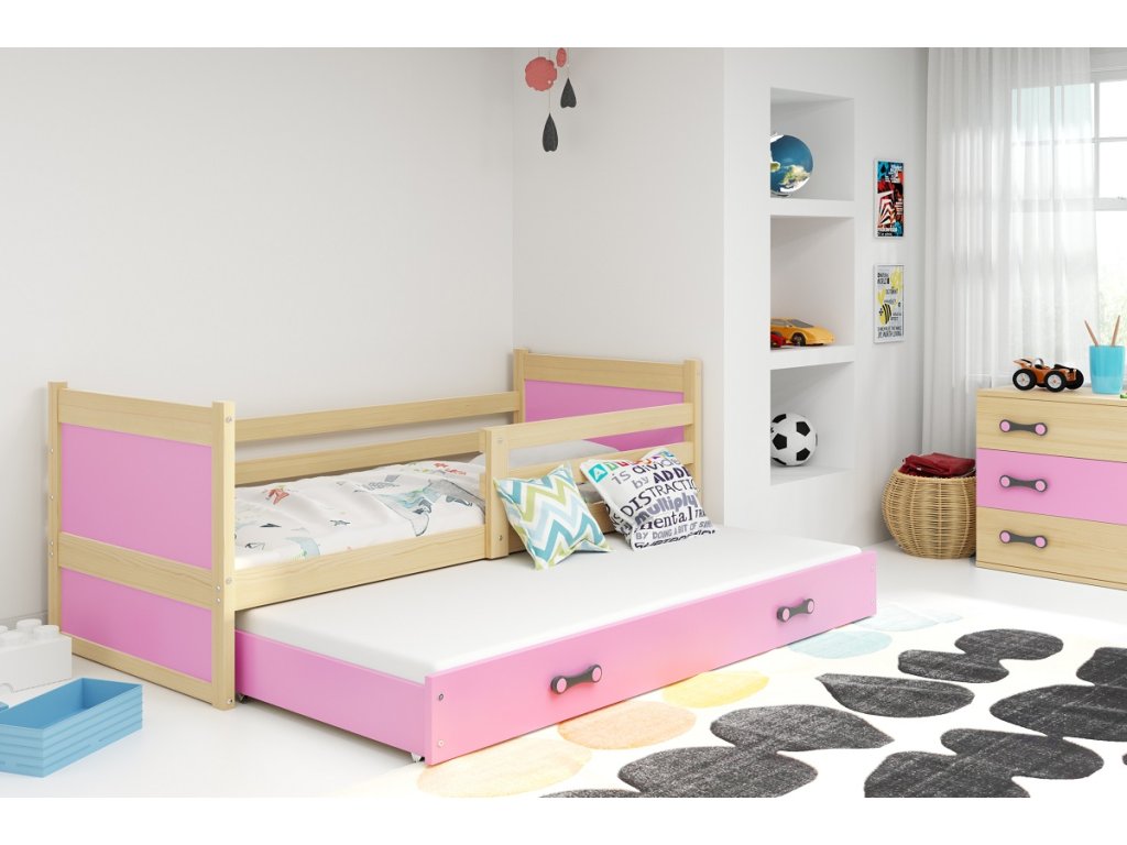 Dětská postel Riky II je určena pro ty, kteří pro své dítě hledají funkčnost, moderní design a kvalitu. Postel je vyrobena z borovicového dřeva v kombinaci s MDF deskou (barevné panely na bocích postele). Její stabilní konstrukce, zaoblené hrany a zábrana, která je v ceně postele, zajišťují bezpečnost a pohodlí dítěte. Zábranu si můžete podle potřeby umístit na pravou, nebo levou stranu postele. Součástí postele je také praktická přistýlka s matrací, kterou můžete využít pro druhé dítě, nebo když u Vašeho dítěte bude chtít přespat kamarád/ka. Obě části postele mají rošt a pěnovou matraci se snímatelným potahem. Tloušťka matrace je 7cm. Plocha pro spaní je 90x200 cm (vrchní část) a 80x190 cm (přistýlka). Postel je dodávána v demontu a součástí je montážní plánek včetně všech potřebných spojovacích materiálů. Vyobrazené dekorace nejsou v ceně.