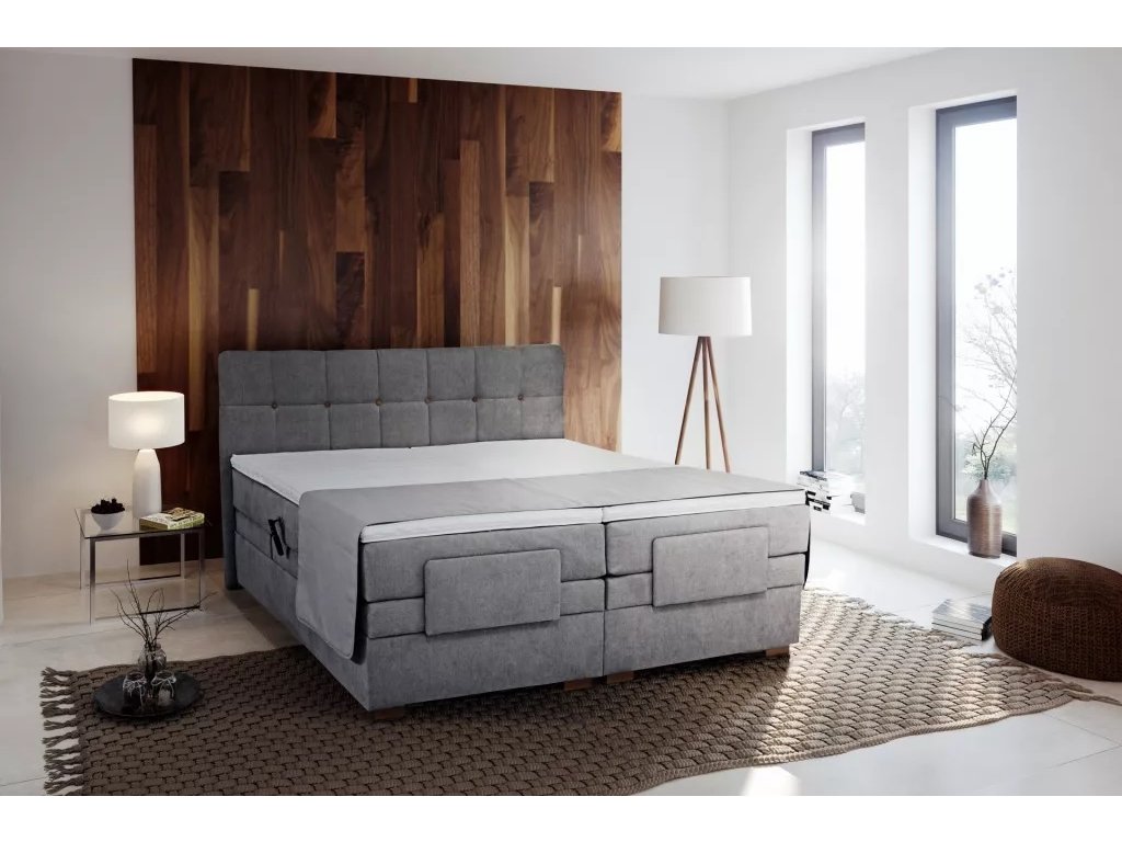 Luxusní motorový boxspring Samael je možno polohovat za pomoci bezdrátového ovladače. V čele postele jsou ve vtazích upevněny knoflíky. První vrstvou postele je jádro tvořené taštičkovými pružinami, které je uloženo uvnitř boxu, který u lůžek typu boxspring nahrazuje lamelový rošt. Vysoké množství malých pružin je samostatně uloženo v textilních taštičkách, které zajišťují výborné kopírování těla uživatele Tento podklad matrace dokáže bodově lépe reagovat než většina lamelových roštů. Druhou vrstvou jsou volně ložené matrace tvořené jádrem z taštičkových pružin, které jsou vhodné pro postele typu boxspring. Jádro se skládá z vysokého množství malých pružin samostatně uložených v textilních taštičkách, které zajišťují výborné kopírování těla uživatele. Rozložení a množství pružin totiž podepírá páteř lépe než běžné pružinové matrace. Boky matrace jsou očalouněné v kvalitní potahové látce . Celková výška matrace v potahu je 18 cm. Postel bude dodána v potahové látce, která je vyobrazena na druhé fotografii.