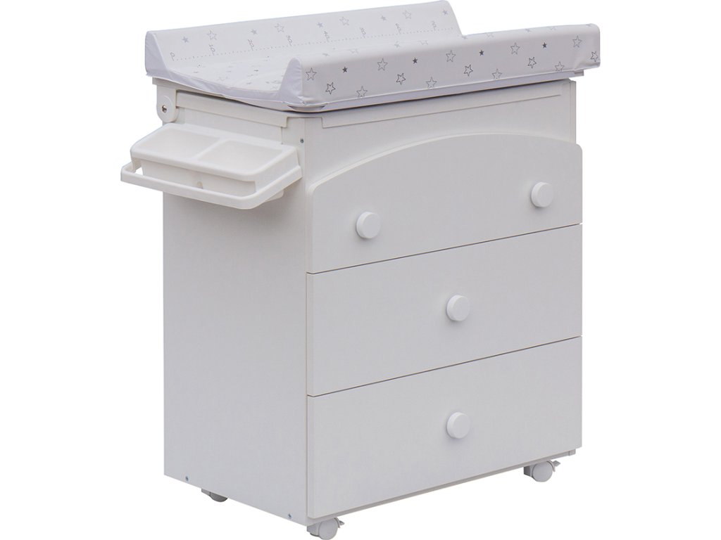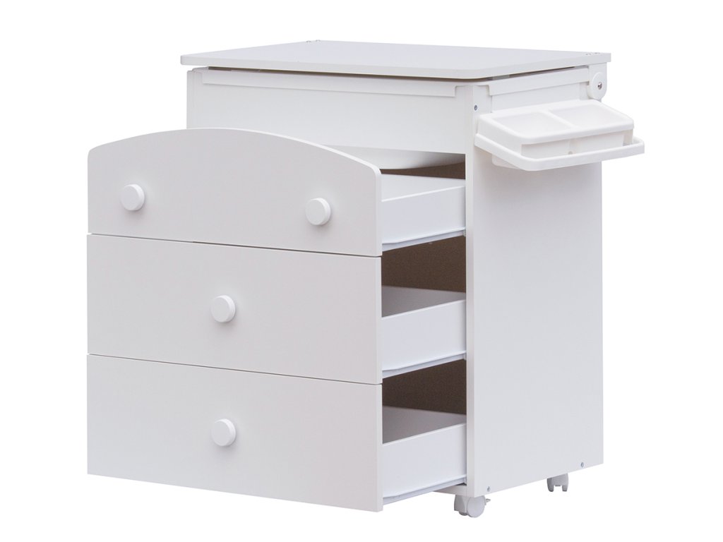 Komoda je také opatřena plastovými kolečky, dvě jsou s brzdou. Komodu lze tedy velmi jednoduše přesouvat dle potřeby. Horní deska nad vaničkou je připevněna na otočných kloubech pro snadné zvedání. Komoda je dále opatřena třemi velkými šuplíky.