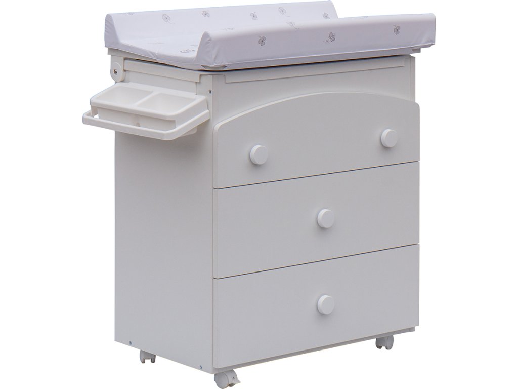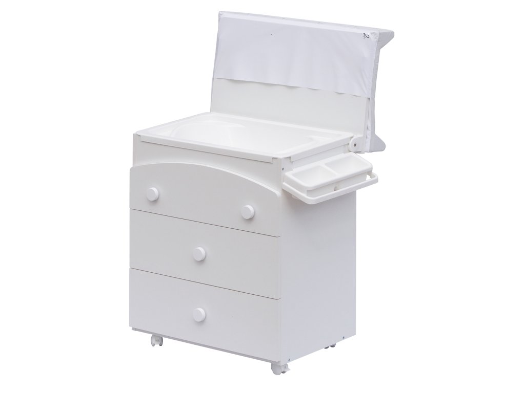 Laminátová přebalovací komoda je doplněna o plastovou vaničku s odkládacími boxy. Vanička je umístěna pod deskou. Pro snadný odvod použité vody je komoda doplněna výtokovou hadicí s uzávěrem. Vaničku lze zcela vyjmout a komodu lze používat jako běžný nábytek do dětského pokoje.