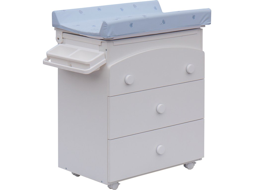 Laminátová přebalovací komoda je doplněna o plastovou vaničku s odkládacími boxy. Vanička je umístěna pod deskou. Pro snadný odvod použité vody je komoda doplněna výtokovou hadicí s uzávěrem. Vaničku lze zcela vyjmout a komodu lze používat jako běžný nábytek do dětského pokoje.