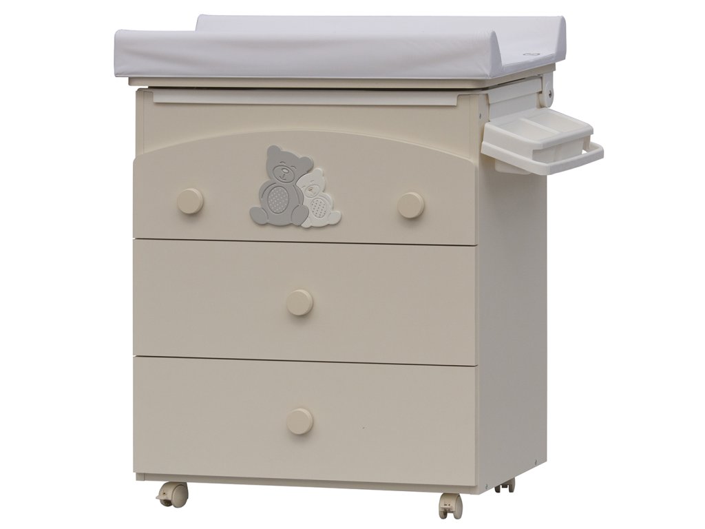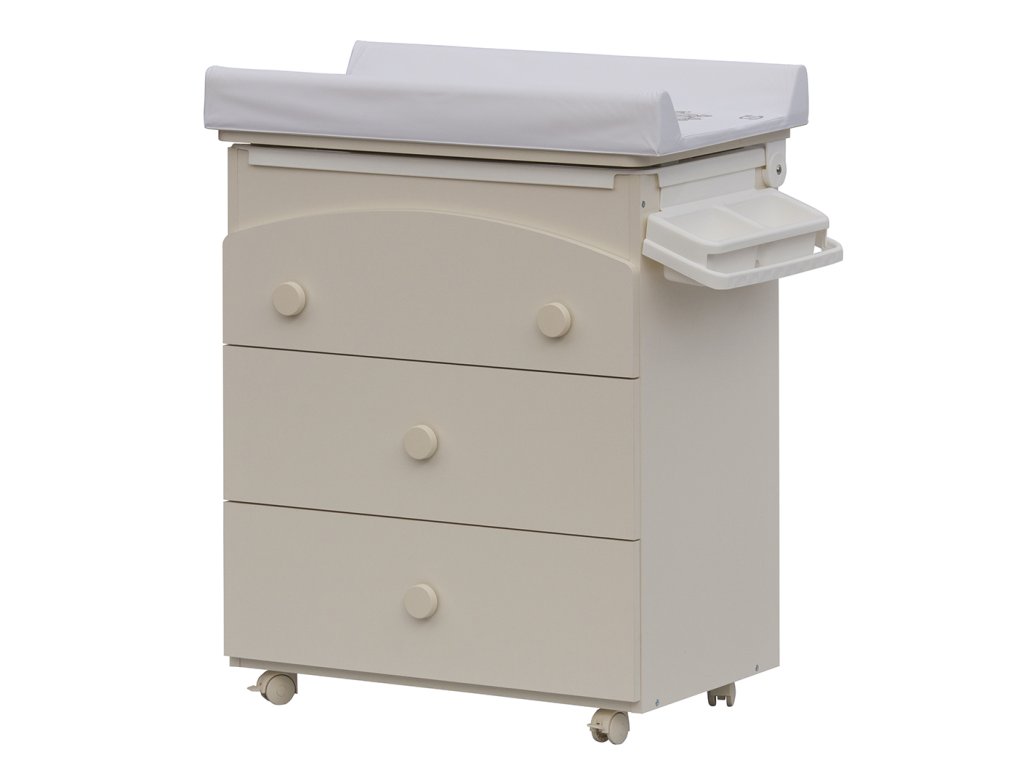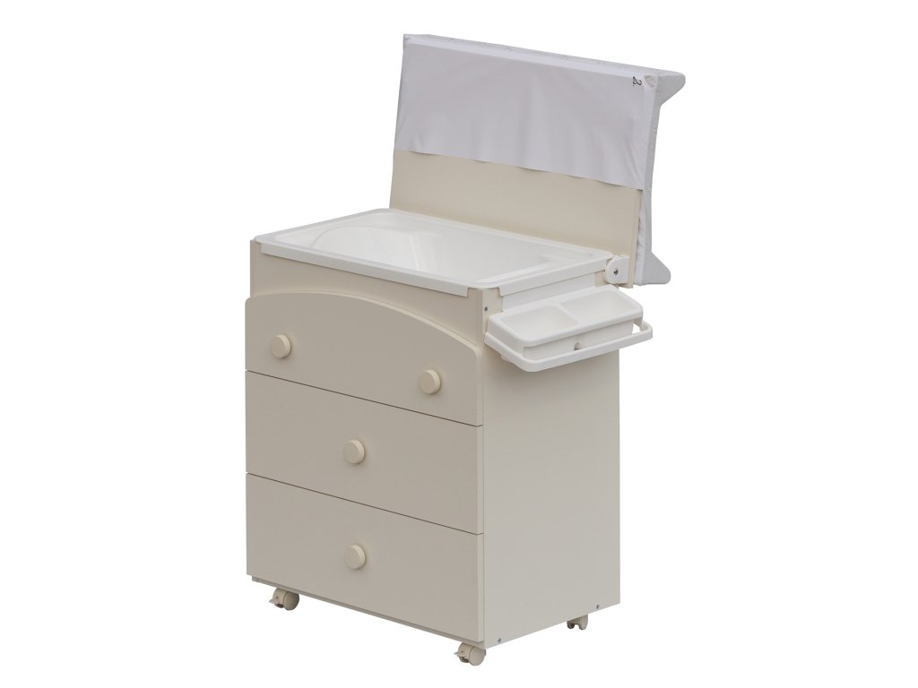 Laminátová přebalovací komoda je doplněna o plastovou vaničku s odkládacími boxy. Vanička je umístěna pod deskou. Pro snadný odvod použité vody je komoda doplněna výtokovou hadicí s uzávěrem. Vaničku lze zcela vyjmout a komodu lze používat jako běžný nábytek do dětského pokoje.