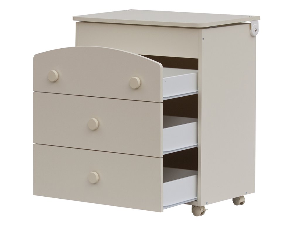 Komoda je také opatřena plastovými kolečky, dvě jsou s brzdou. Komodu lze tedy velmi jednoduše přesouvat dle potřeby. Horní deska nad vaničkou je připevněna na otočných kloubech pro snadné zvedání. Komoda je dále opatřena třemi velkými šuplíky.