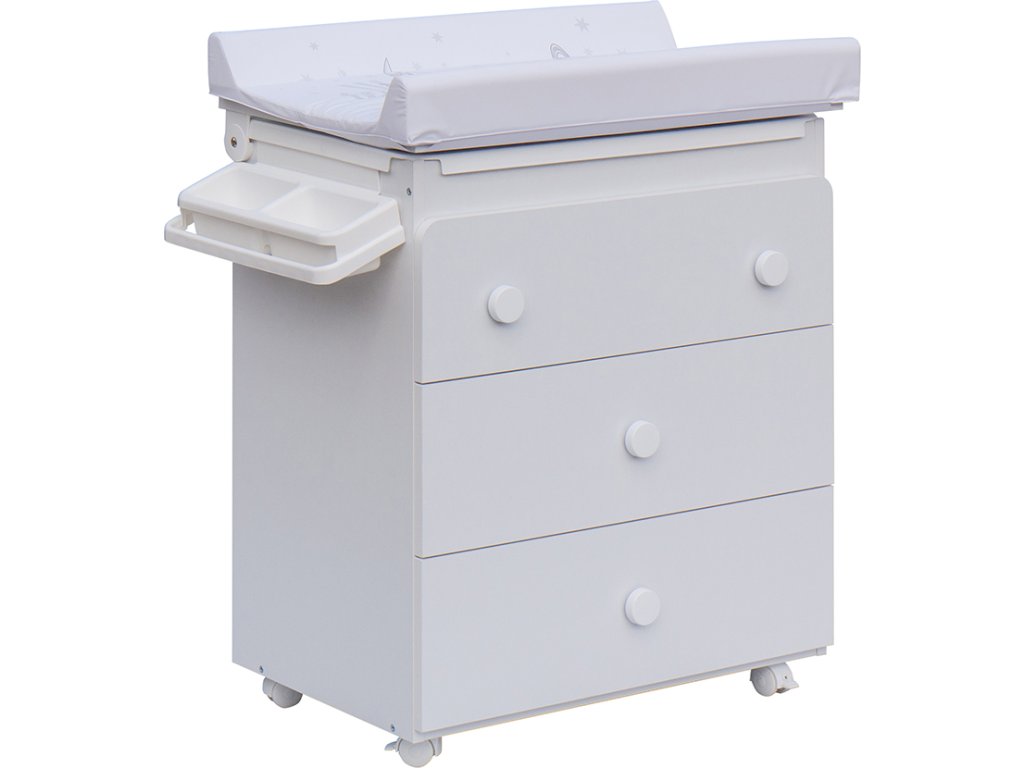 Komoda je také opatřena plastovými kolečky, dvě jsou s brzdou. Komodu lze tedy velmi jednoduše přesouvat dle potřeby. Horní deska nad vaničkou je připevněna na otočných kloubech pro snadné zvedání. Komoda je dále opatřena třemi velkými šuplíky.
