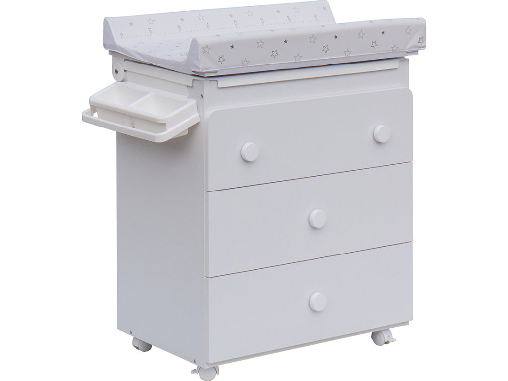 Komoda je také opatřena plastovými kolečky, dvě jsou s brzdou. Komodu lze tedy velmi jednoduše přesouvat dle potřeby. Horní deska nad vaničkou je připevněna na otočných kloubech pro snadné zvedání. Komoda je dále opatřena třemi velkými šuplíky.