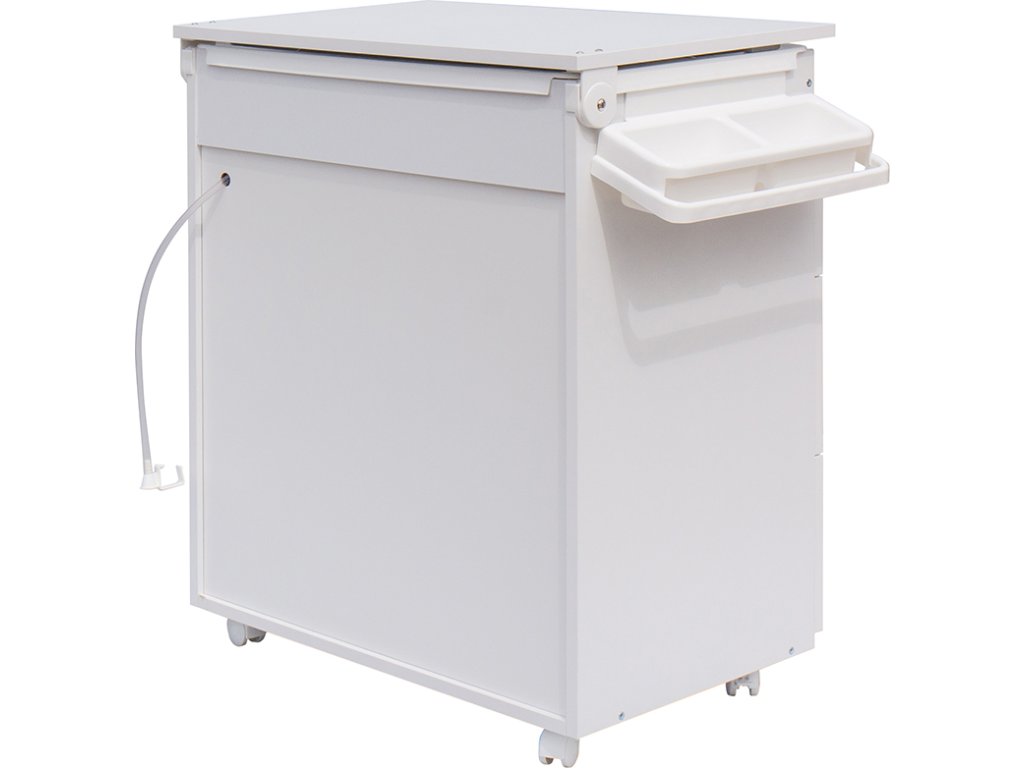 Komoda je také opatřena plastovými kolečky, dvě jsou s brzdou. Komodu lze tedy velmi jednoduše přesouvat dle potřeby. Horní deska nad vaničkou je připevněna na otočných kloubech pro snadné zvedání. Komoda je dále opatřena třemi velkými šuplíky.