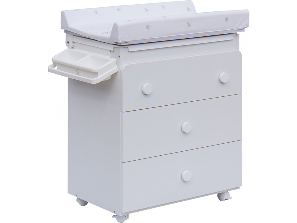 Laminátová přebalovací komoda je doplněna o plastovou vaničku s odkládacími boxy. Vanička je umístěna pod deskou. Pro snadný odvod použité vody je komoda doplněna výtokovou hadicí s uzávěrem. Vaničku lze zcela vyjmout a komodu lze používat jako běžný nábytek do dětského pokoje.