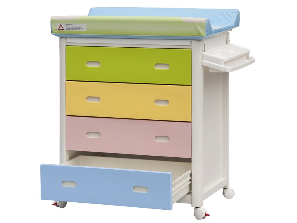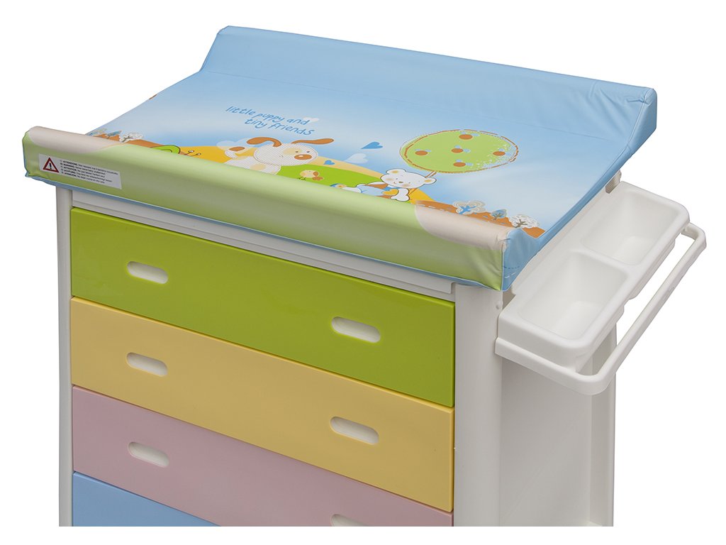 Materiál celé komody je zdravotně nezávadný plast. Komoda je vybavena kolečky s brzdou. Komodu lze tedy velmi jednoduše přesouvat dle potřeby. Po odklopení tvarovaného přebalovacího pultu se zpřístupní vanička.