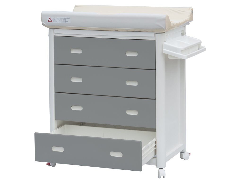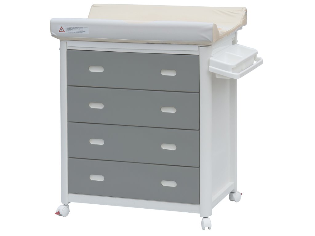 Materiál celé komody je zdravotně nezávadný plast. Komoda je vybavena kolečky s brzdou. Komodu lze tedy velmi jednoduše přesouvat dle potřeby. Po odklopení tvarovaného přebalovacího pultu se zpřístupní vanička.