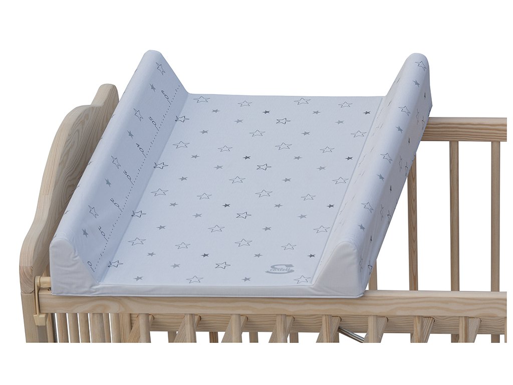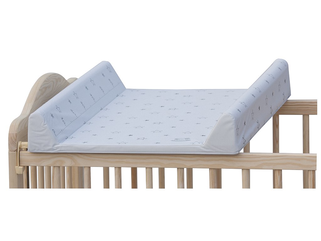 Přebalovací podložka s pevnou vložkou z MDF a profilovanými okraji s kvalitním PVC potahem bez ftalátů, vyplněná molitanem.