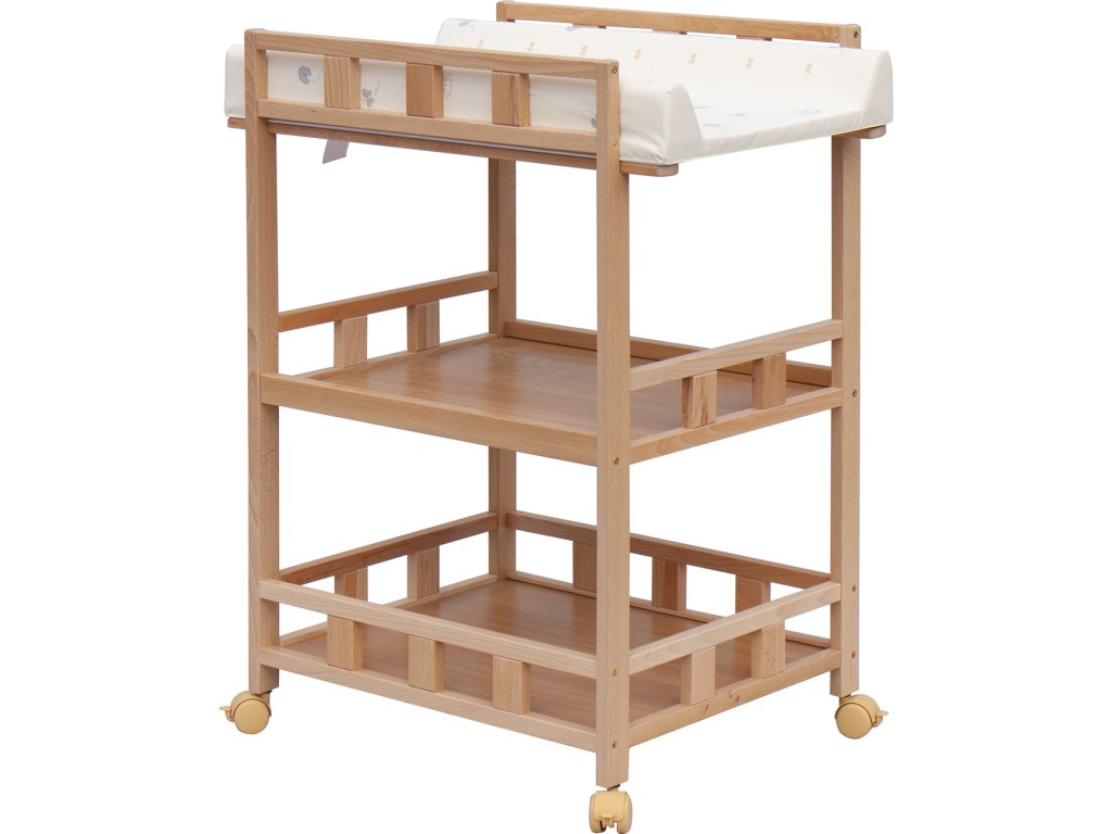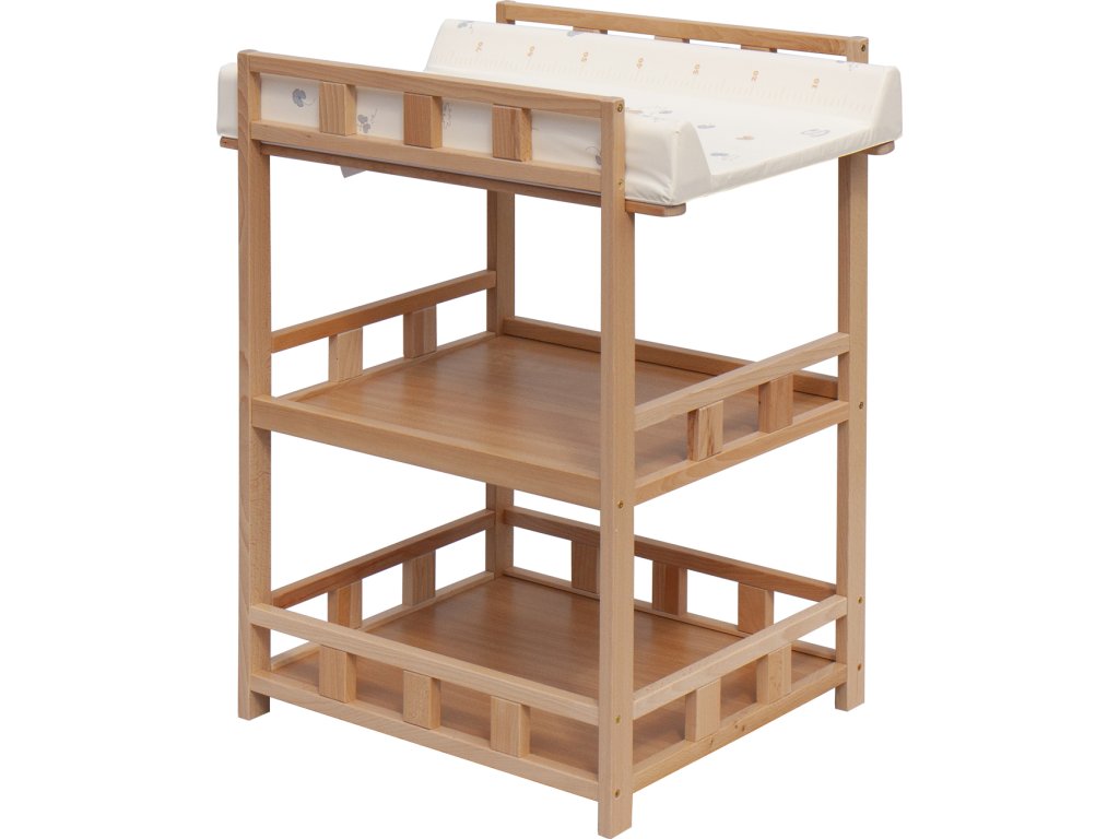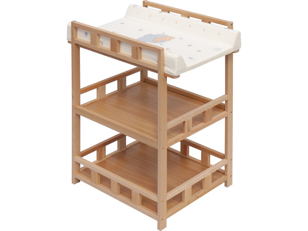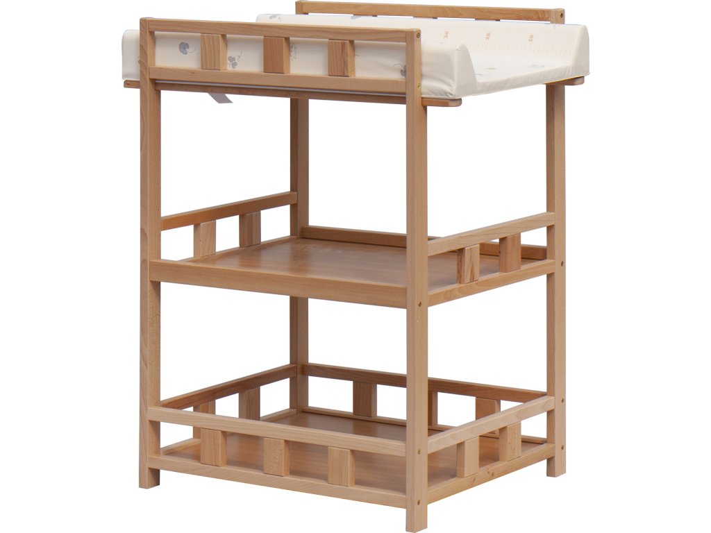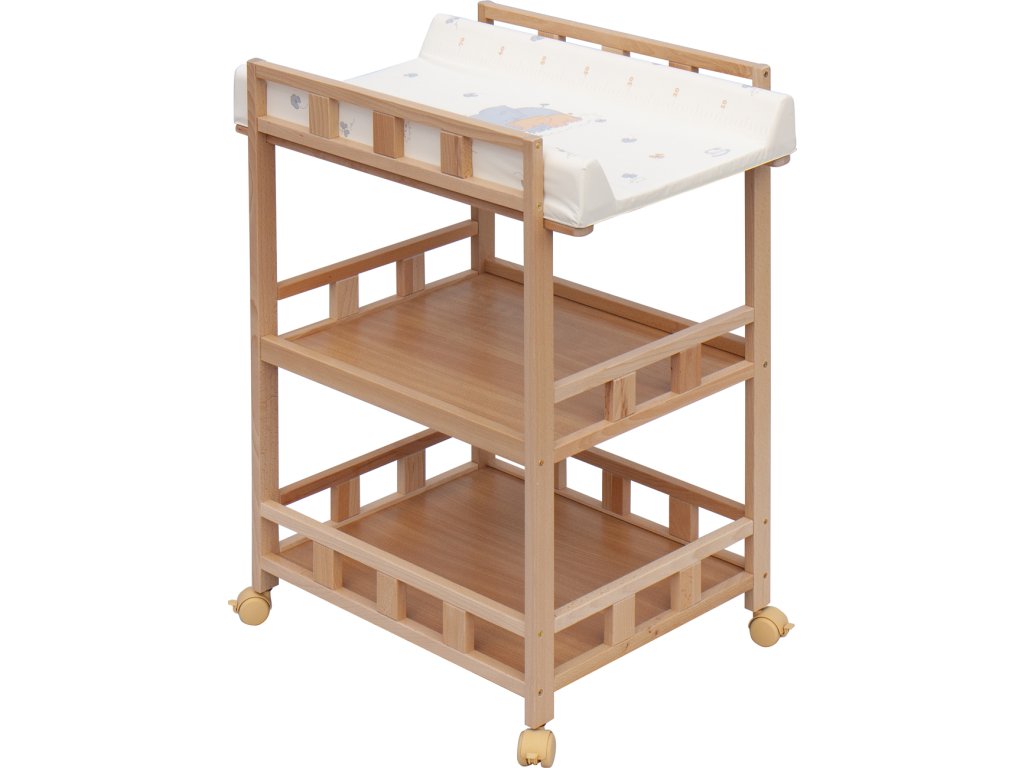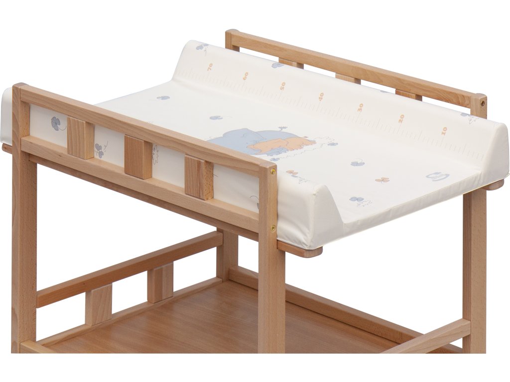 Praktický přebalovací pult se dvěmi policemi z HDF desky. Vrchní přebalovací pult z polyuretanu potažený omyvatelným PVC, vyztužený MDF deskou.