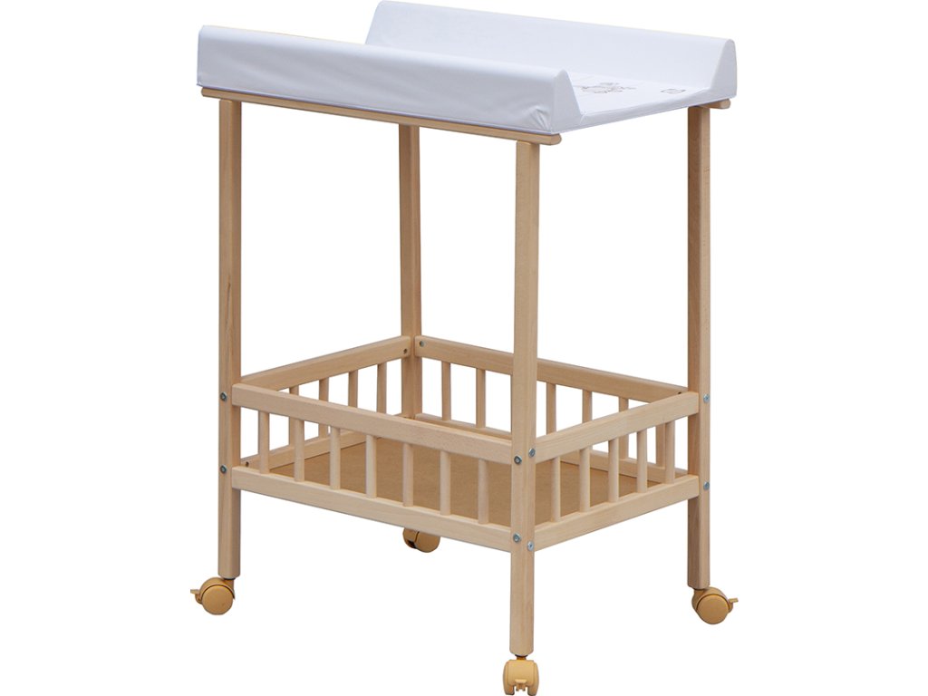 Praktický přebalovací pult se dvěmi policemi z HDF desky. Vrchní přebalovací pult z polyuretanu potažený omyvatelným PVC, vyztužený MDF deskou.